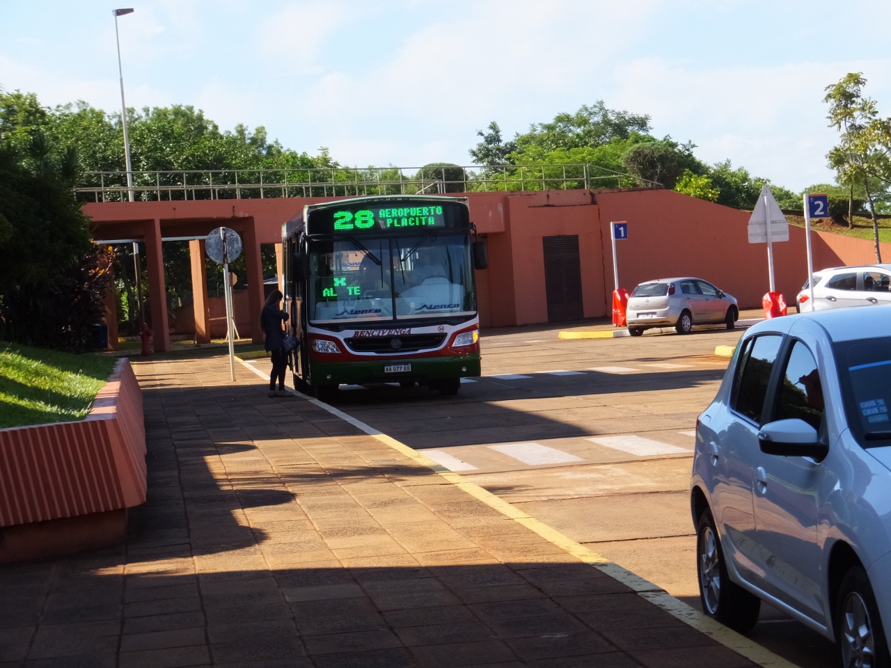 ポサーダス空港から市内中心部へのバスのアクセスについて。空港のバス乗り場は到着ホールから一旦外へ出て、階段を下りた1階部分、右手に有る。バスの絵の入ったサインがあるので、それが目印。