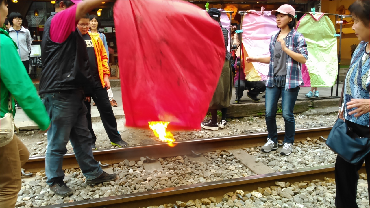 ツアーで天燈あげ体験をしました。バスで行きましたが、天燈あげをする場所は、線路!