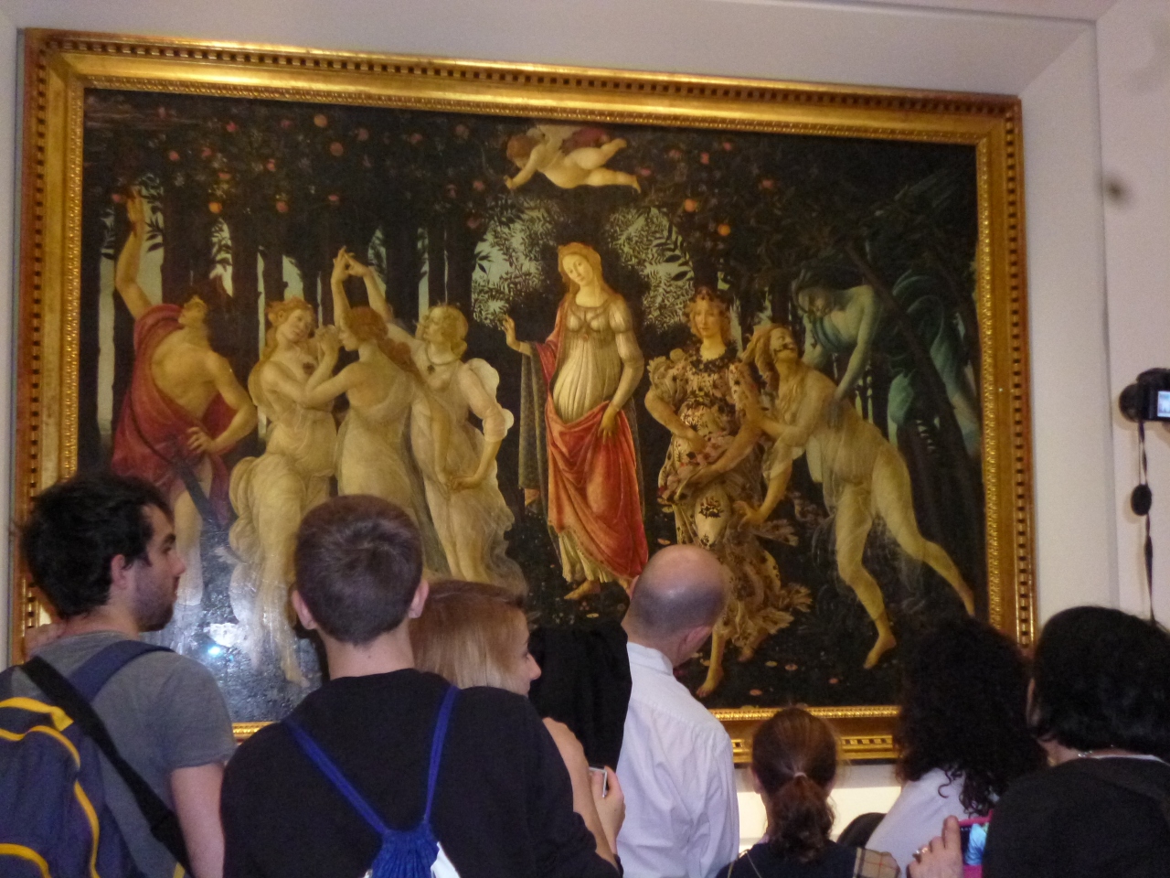 40数年間再訪を希望していた美術館。うっすらと建物の長方形は覚えていた。予約の人は15分前に美術館の近くの入場券との引き換え所で交換。やはり人は多いが8:30入場だったので、それなりに少ない。ゆっくりとじっくりと回る。また、ガイドに書かれた部屋にあるというより、特に有名どころは3階でなく、2階に集めてあった。3階でカフェがあり、そこからベッキオ宮殿がよく見える。