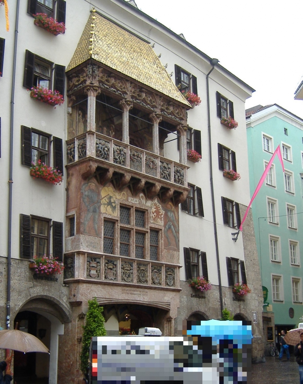 旧市街の中心部にある黄金の小屋根は、マリア・テレジア通りから続くヘルツォーク・フリードリヒ通りの角の建物の3階部分にあり、皇帝マクシミリアン1世が広場で行われる行事を見物するために造らせたものだそうですが、黄金の小屋根よりも斜め前にあるヘルプリングハウスの方がロココ様式の華やかな飾り装飾が施されており、目立っていました。