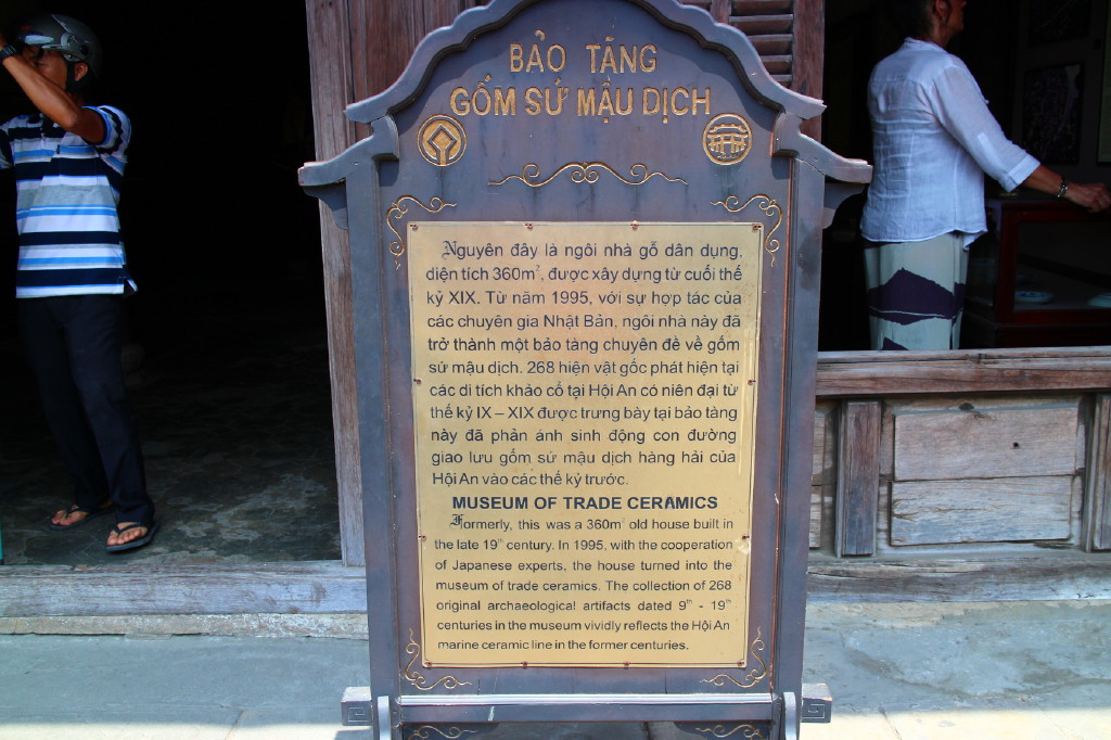 ホイアンの中心部を通るチャンフー通りにあり19世紀末の古民家を日本人の専門家が1995年に博物館に改装したと英文で書いてありました。展示物はホイアン周辺で発掘された陶磁器や沈没船から引き揚げられた遺物など。建物は木造でかなりの年代を経てきた様子が感じられ日本にもありそうな古民家だった。2階にもあがれるのでチャンフー通りを上から見るとまた景色が違う。