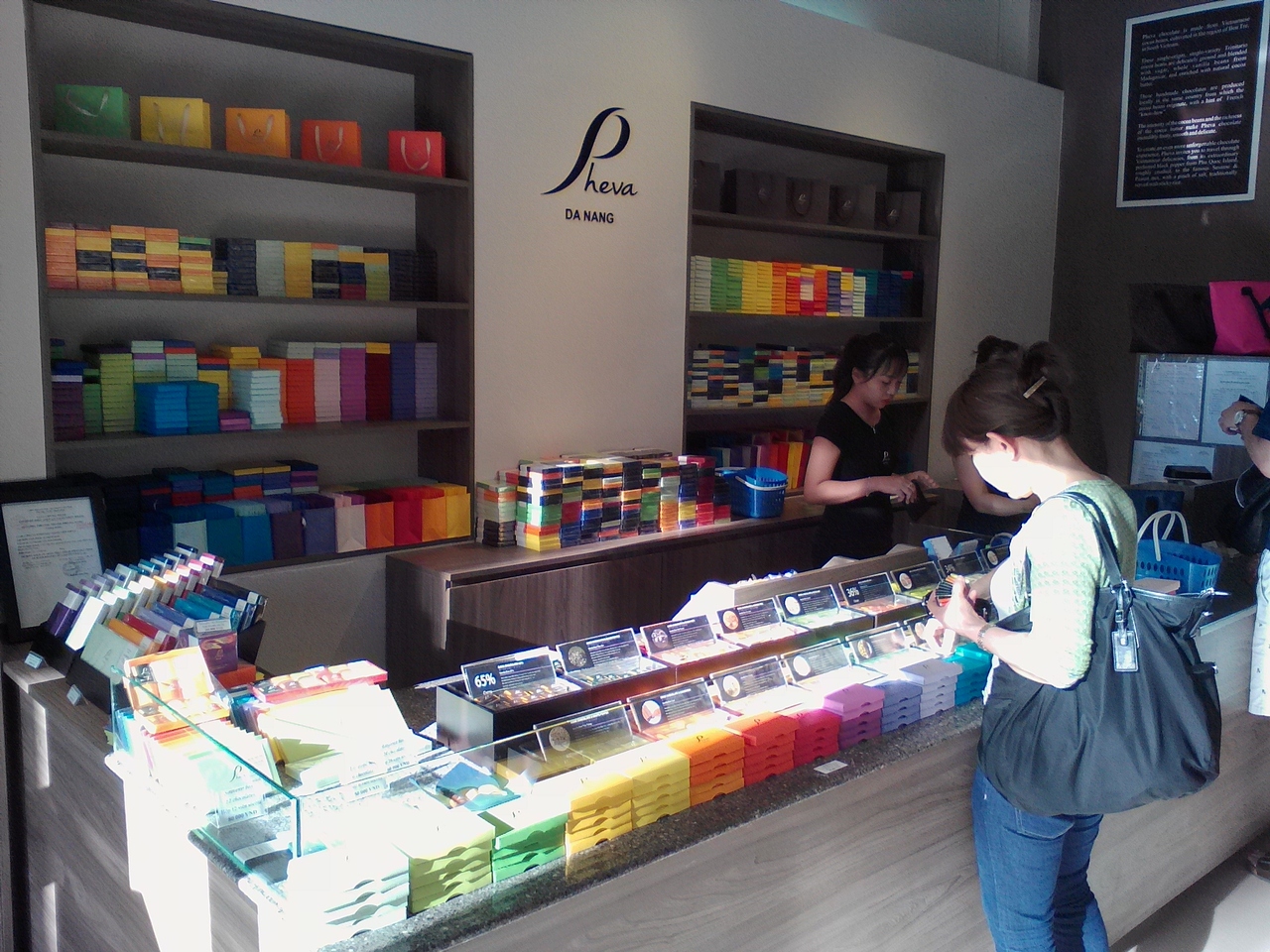 チョコレートは3cm角ほどの大きさで全18種類。一番人気はダークチョコ黒コショウだそうです。他にはオレンジの皮、ショウガ、シナモン、ゴマ&ピーナッツ、ピスタチオ&レーズンなどがあります。12個入りの箱にどれでも好きな物をチョイスして8万ドン、24個入りが16万ドンです。おすすめがあらかじめ入れられたものも同じ値段であります(6個入りで5万ドンもあり)。持って帰るときに溶けないように保冷剤付きのクールバッグも7万ドン~(大きさによって変わります) 販売しています。
