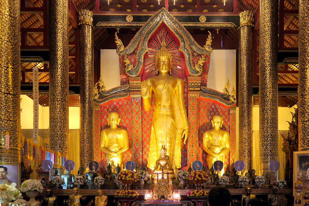 本堂は金色で埋め尽くされた絢爛さに目を引かれる。入り口の両側にはナーガが鎮座している。広い内部にはたくさんの仏像が。