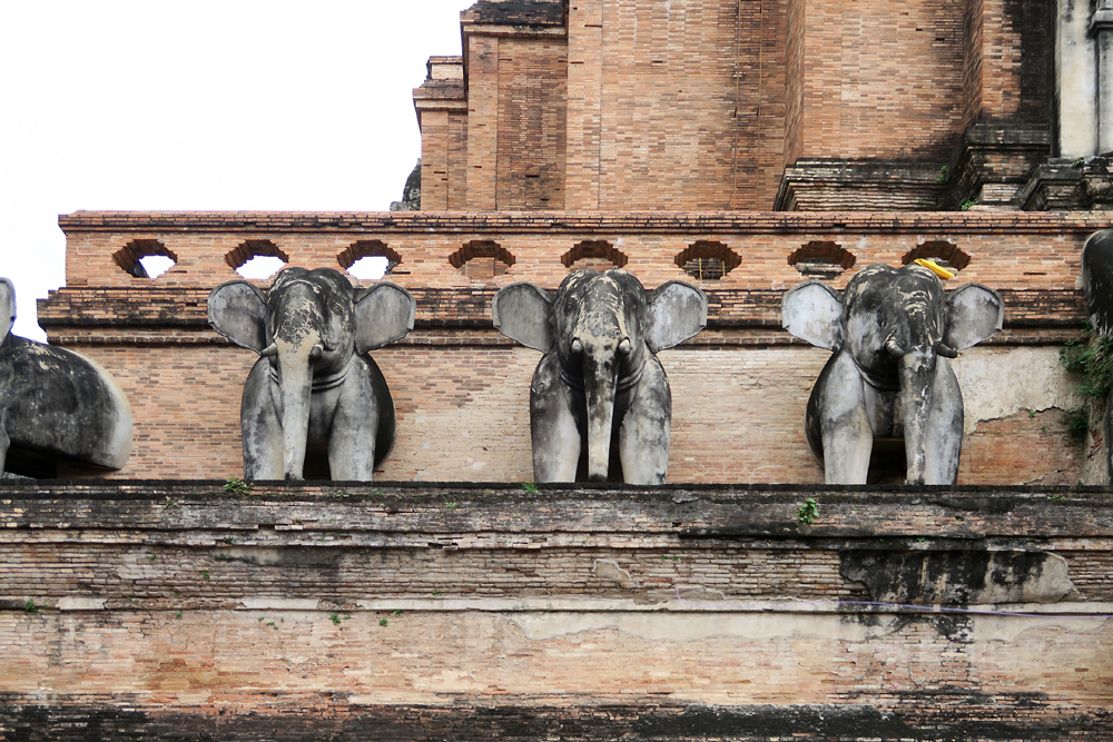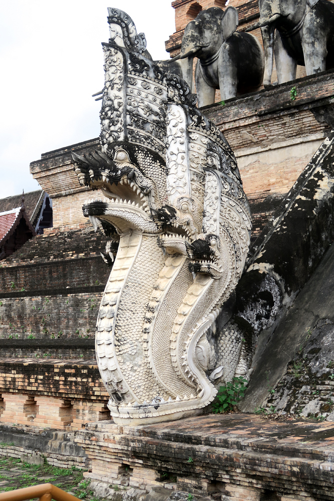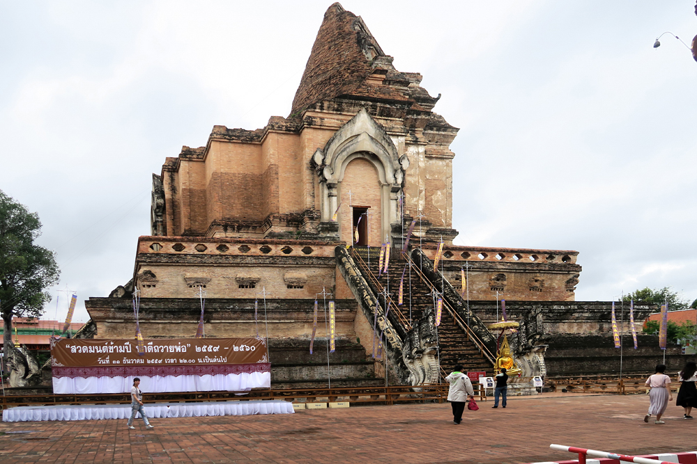 600年前に建てられた仏塔チェディ・ルアンは86メートルの高さがあったが、1545年の地震で上部30メートル程が崩れてしまった。一周するととても古く風化してきているのが観られる。上部にある象の像も一部は崩壊したものもある。ナーガも歴史を感じさせる。