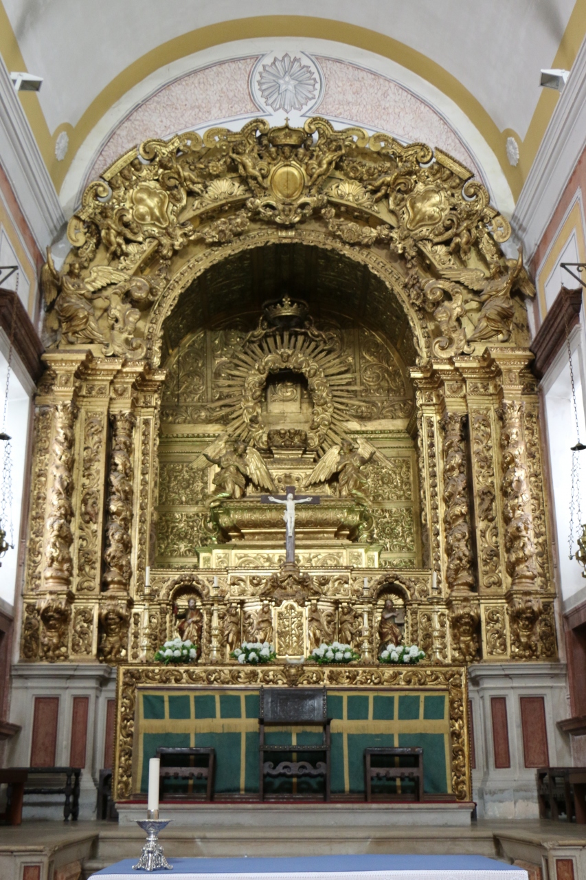 内部はサンタ・マリア教会に比べ簡素な造りですが、見どころは祭壇背後の飾り壁の金泥の浮き彫り彫刻で、とても見事です。