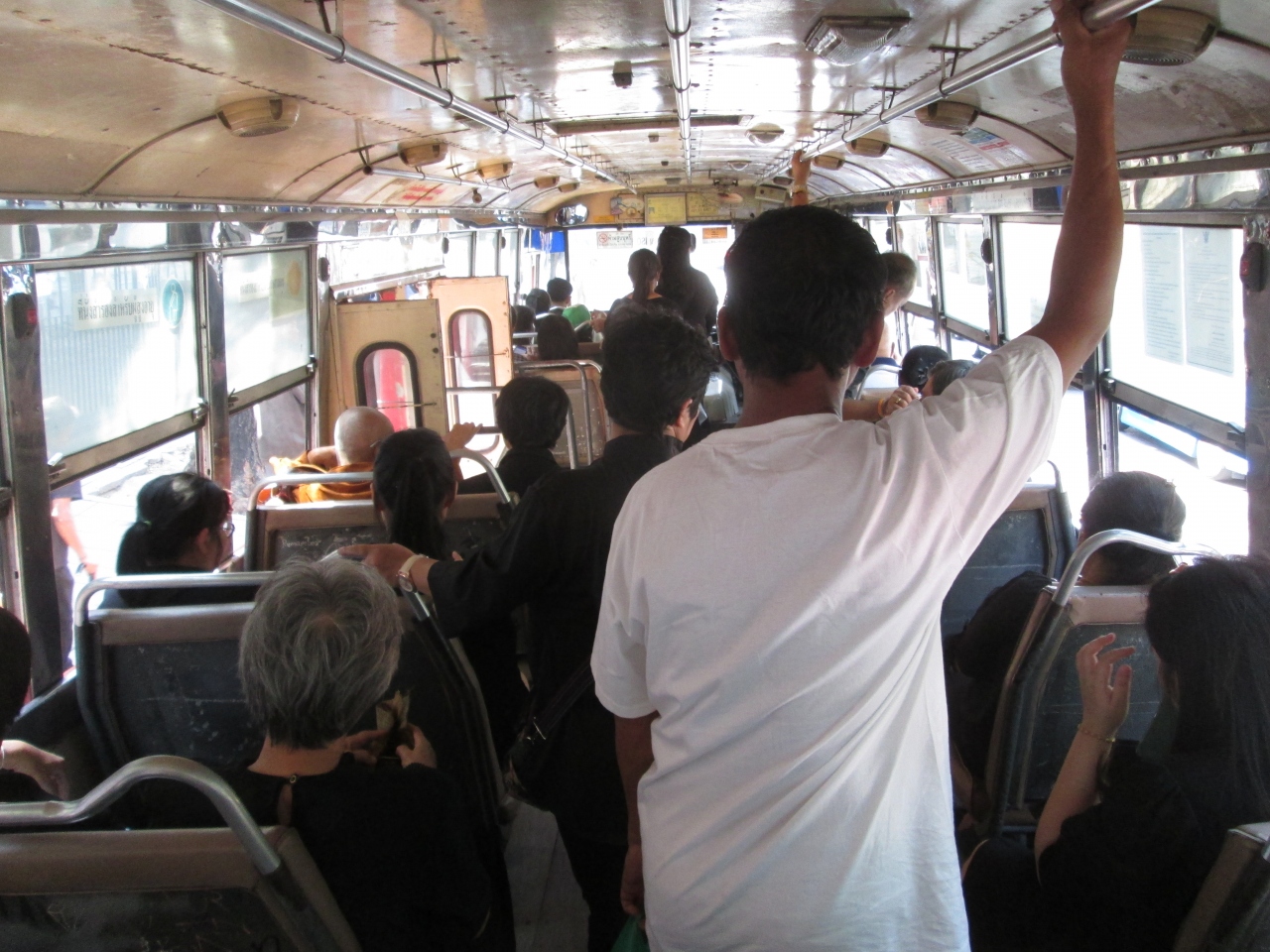 エアコンなしバスに乗車しました。王宮付近には運行本数が多かったです。両脇の窓は全開で、床は木で造られていました。2月のバンコクは暑さが厳しくなかったので、そこそこ快適に移動できました。何といっても運賃が安いのがメリットです。