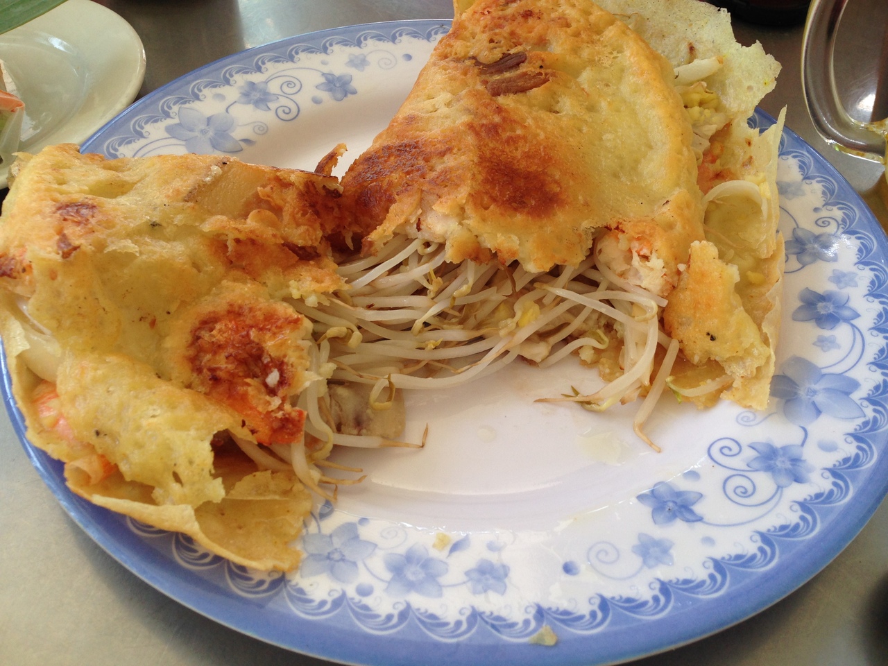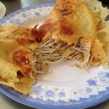 たくさんのもやしと豚バラ、エビが入っています。アツアツです。野菜を巻いて酢をつけていただきます。
