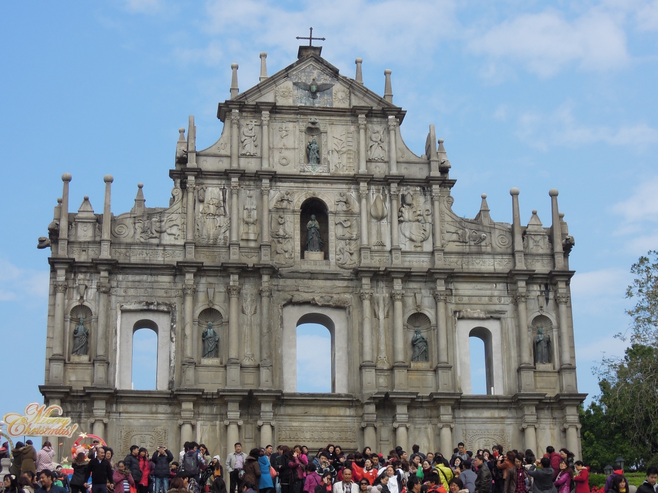 マカオのパンフレットなどで必ず目にする有名観光地。人で溢れていて非常に混み合っていました。広場や階段も人でいっぱいです。イエズス会によって建てられた教会の跡地で、火災により現在は正面の壁のみが残っています。天主堂の前にある広場と階段も共に世界遺産となっています。