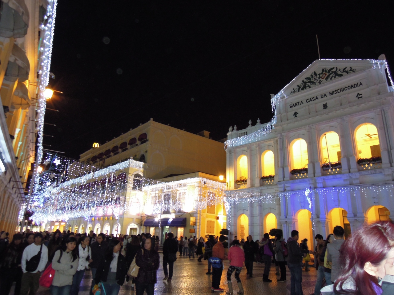 マカオの観光名所。終日観光客で賑わっています。波模様の石畳みが可愛らしく、パステルカラーの建物がよく似合っています。ポルトガルの街並みを楽しめます。エッグタルトのお店やポルトガル料理のお店も周囲にあります。夜のライトアップはとてもキレイでした。