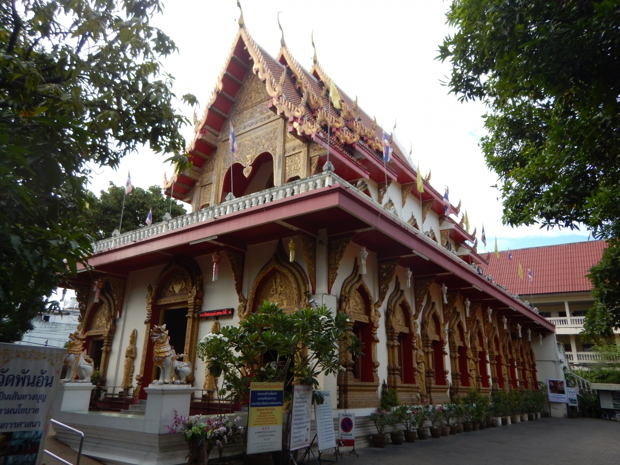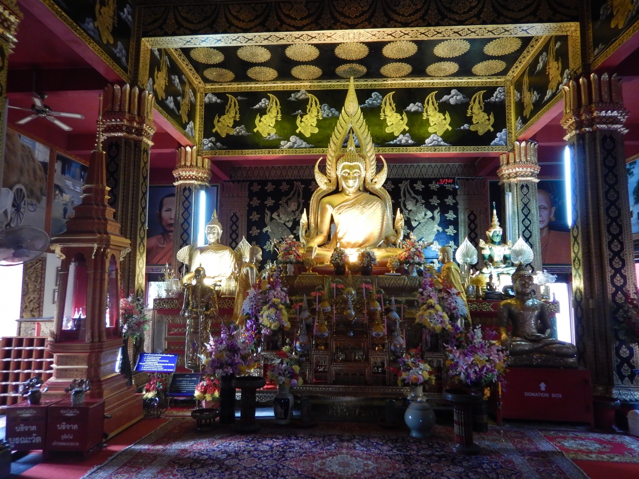 ラーチャーダヌーン通りに面した寺院ではかなり大きな方だ。午後になって前を通りとサンディーマーケットの準備が行われていた。本堂の建物はかなり新しく、大きなものだった。本堂には中央の仏像以外にも左右、前に仏像が並んでいる。特に右後ろの緑色の仏像を見るとエメラルドでできているのではないかと思ってしまう。内部には壁画が描かれており、見事だ。