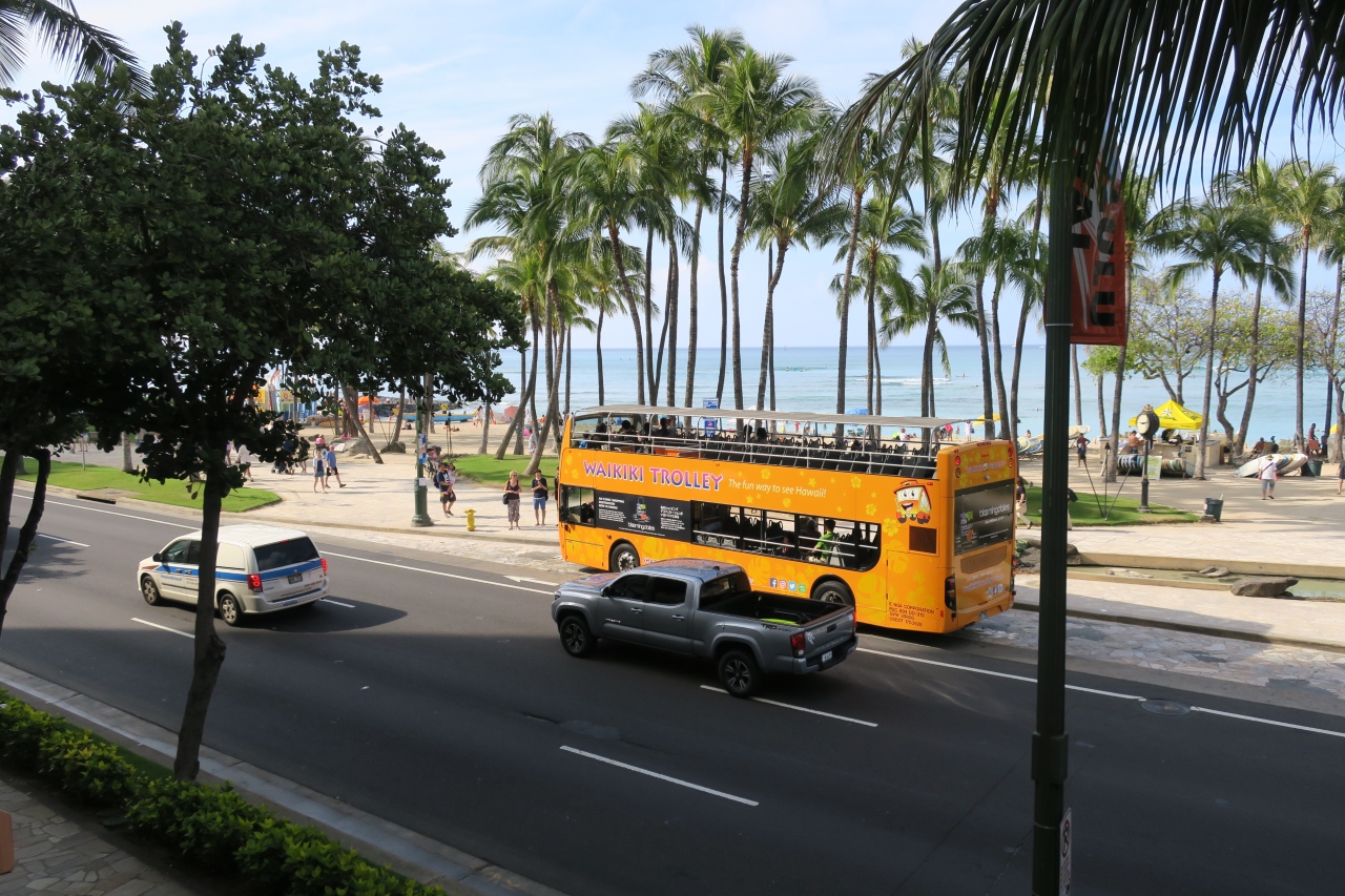ワイキキから、アラモアナショッピングセンターに行くときはjcbカードを使って、無料でワイキキトロリーに乗れるので便利です。アラモアナ方面だけは利用者が多いので2階建てバスが走ってます。2階席に座り、ハワイの風を受けながら幸せな気分に・・・。