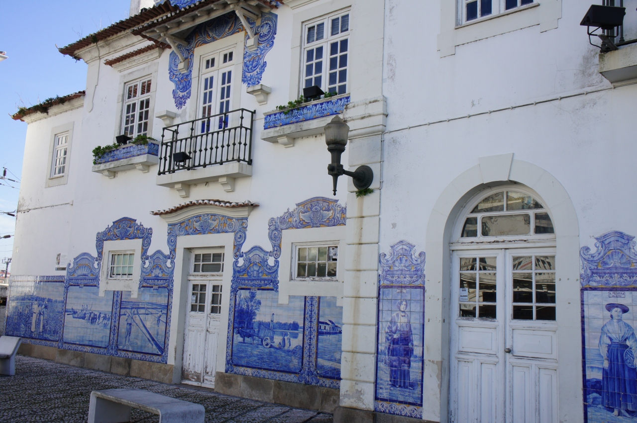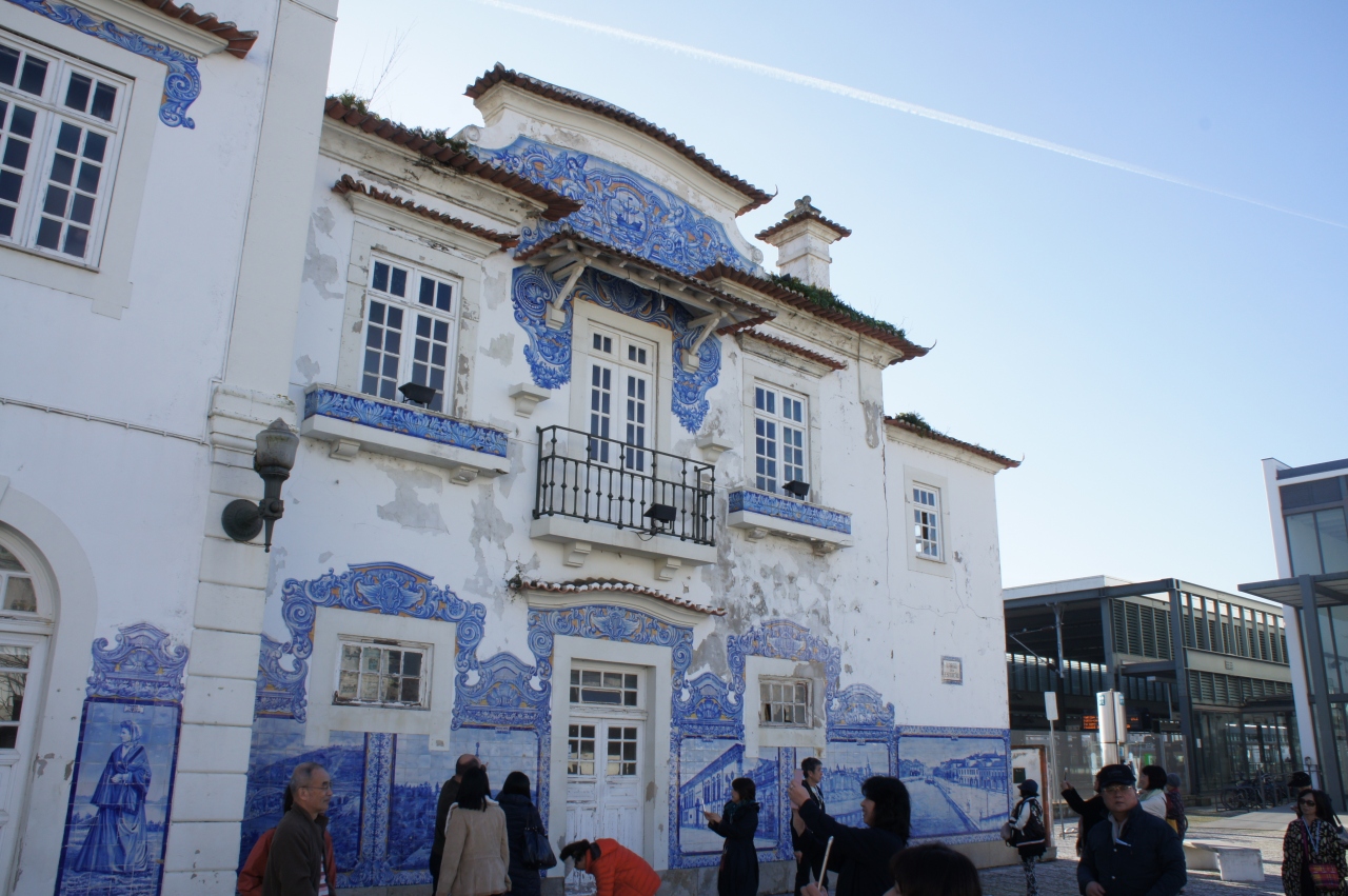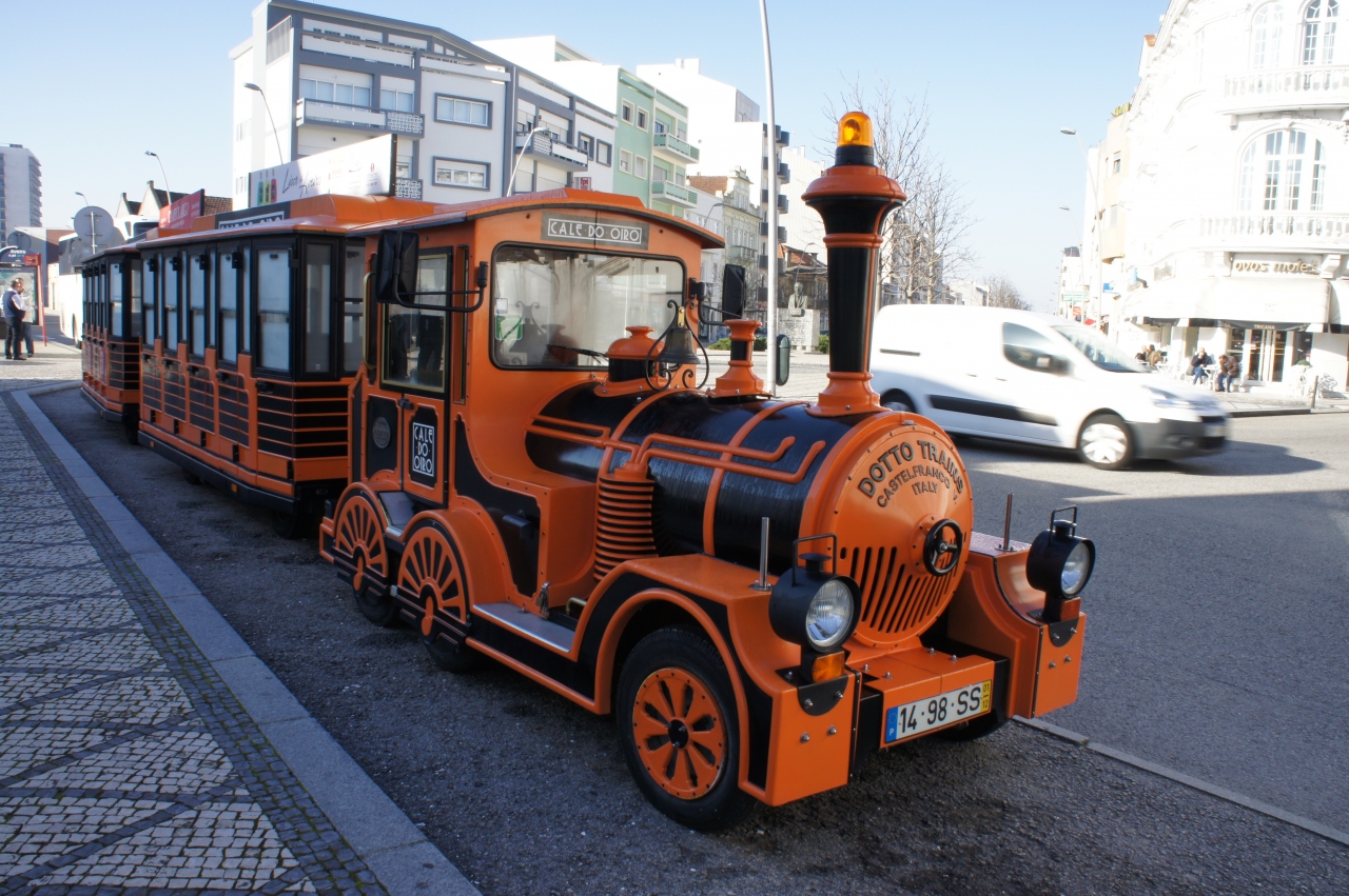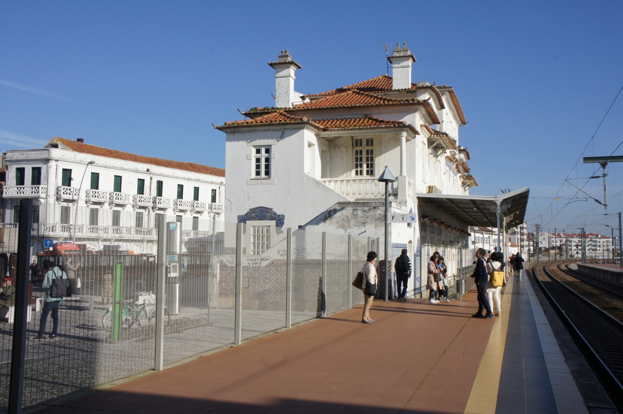 アヴェイロ駅は新駅と旧駅が並んで建っています。旧駅の彩色タイルは見事です。道路側から見えて、旧駅舎の前には広場があり、思い思いに写真撮影ができます。タイルが作られた当時の農漁村の暮らしや人々の服装などがリアルに描かれています。隣の新駅に入ると、白い雄牛のマスコットが何気なく置かれています。ホームにも自由に入ることができ、ホームから見える旧駅の駅舎も垣間見ることができます。旧駅の前の道路にはミニSL型の二両編成のポットトラムが停車していて、とても可愛らしく見えます。