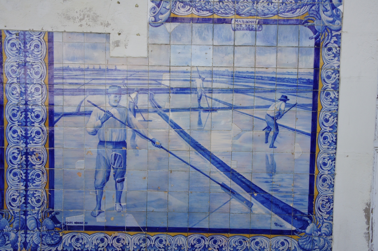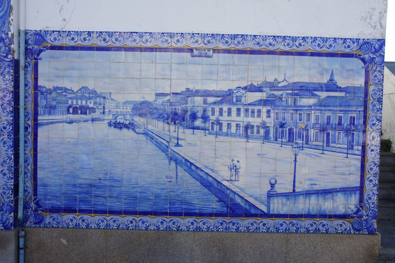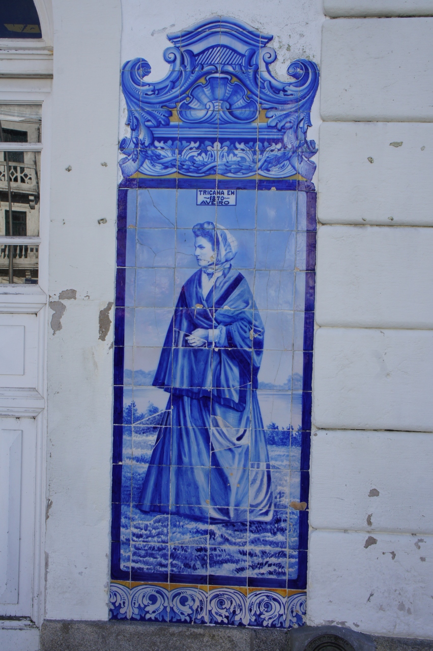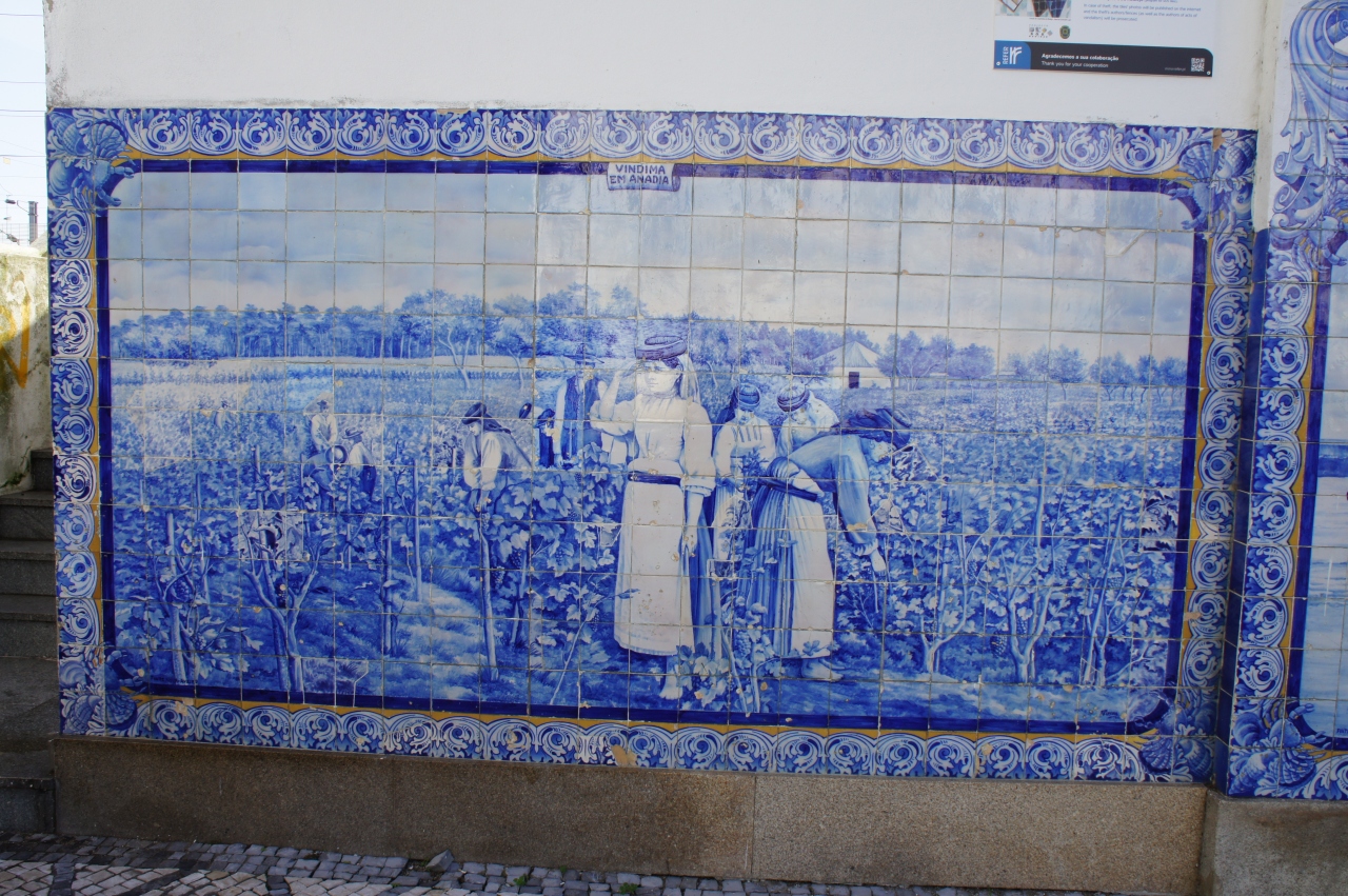アヴェイロ駅は新駅と旧駅が並んで建っています。旧駅の彩色タイルは見事です。道路側から見えて、旧駅舎の前には広場があり、思い思いに写真撮影ができます。タイルが作られた当時の農漁村の暮らしや人々の服装などがリアルに描かれています。隣の新駅に入ると、白い雄牛のマスコットが何気なく置かれています。ホームにも自由に入ることができ、ホームから見える旧駅の駅舎も垣間見ることができます。旧駅の前の道路にはミニSL型の二両編成のポットトラムが停車していて、とても可愛らしく見えます。