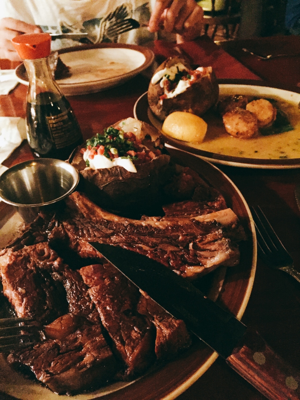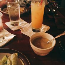 店内は薄暗くて落ちついた感じです。3人でキングカットとホタテのソテーのメインを1つずつ、メインを頼むとサラダバーが付いてくるので、一人分追加でサラダバーを頼みました。
