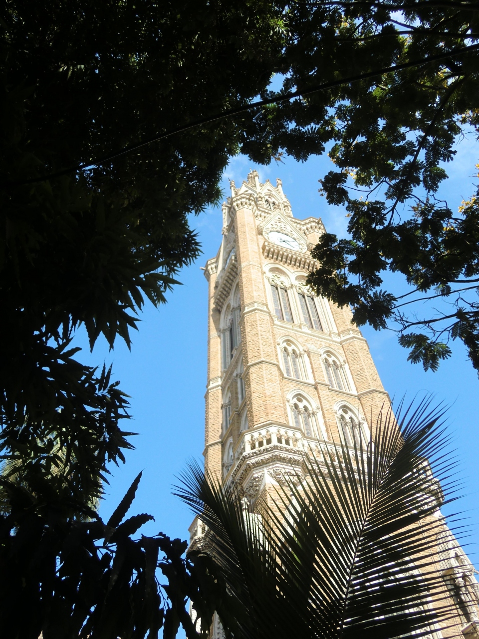 真下から時計塔を撮影すると周りの木々が邪魔で時計塔が隠れてしまい、うまく撮れなかったところ、ムンバイ大学の学生が丁寧に木々の切れ間まで案内してくれました。