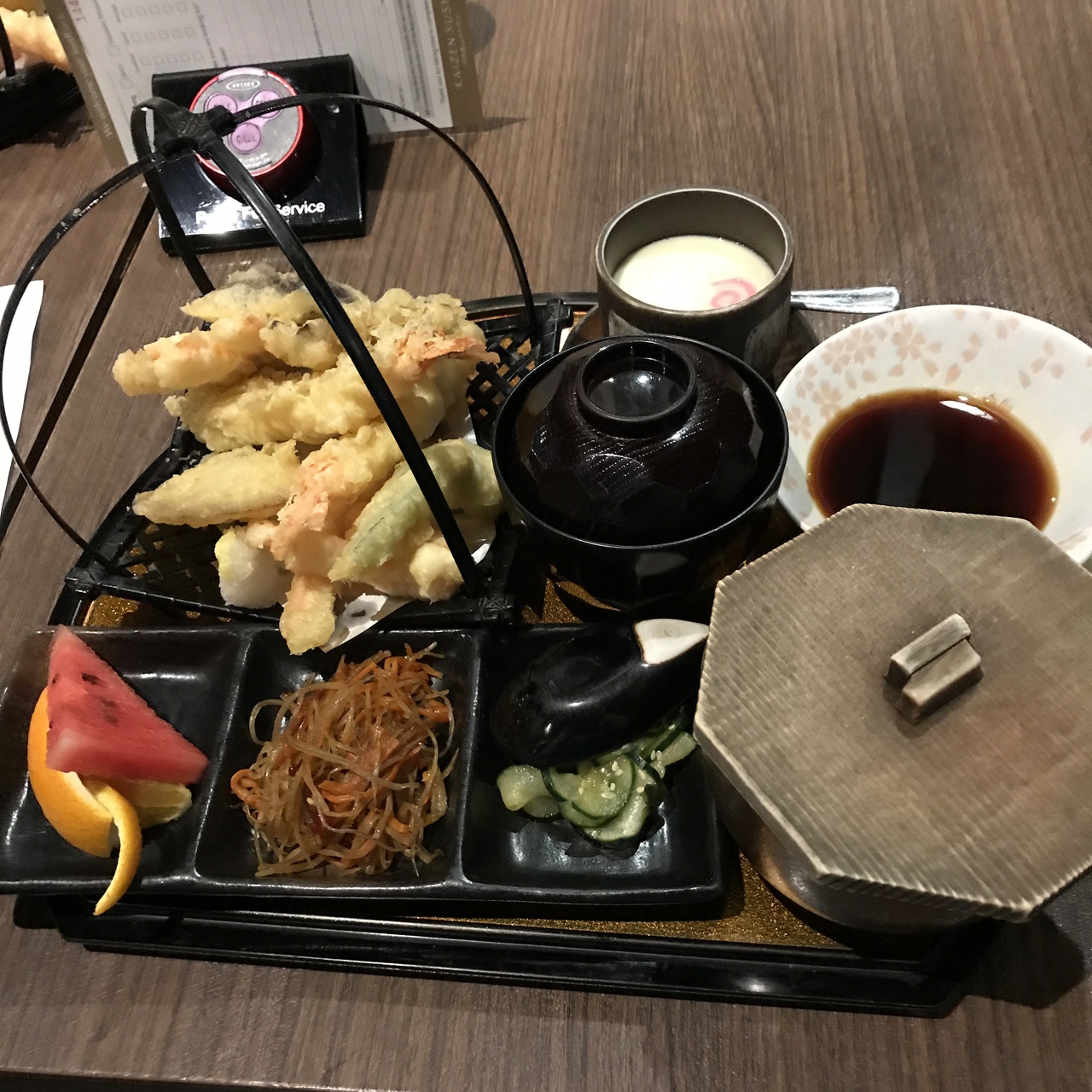 天ぷら定食で、きんぴらごぼうと天つゆはかなり甘いなと感じたが、天ぷらはさっくりでした。