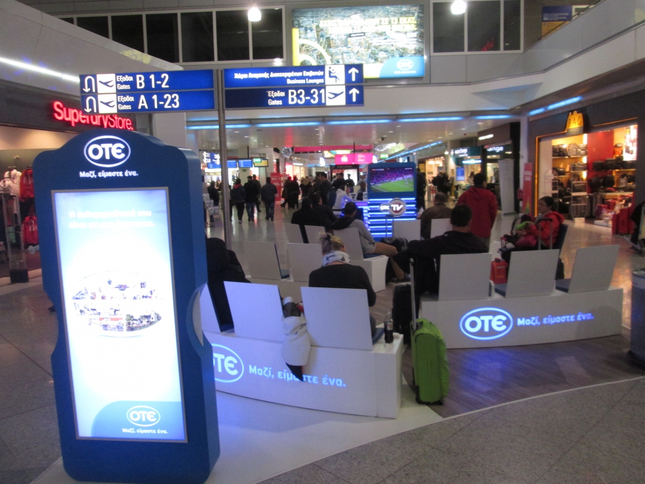 利用する航空会社のチェックインカウンターが出発の2時間30分前にしかオープンしないとのことで、アテネ国際空港ターミナル内を散策しました。待たされても飽きないような製品の広告ブースがありました。韓国の会社がギリシャにも進出していたことは驚きました
