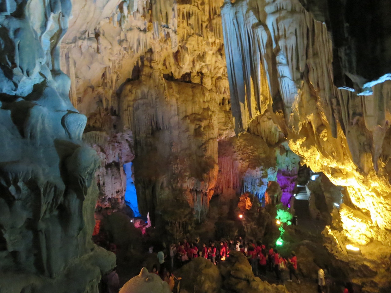 有名な闘鶏岩の周りはクルーズ船が密集し、順番待ちで写真を撮るようになります。石灰岩の岩山なので鍾乳洞もありますが、岸壁から岩山を登って行くので、洞窟に入るまでに大汗をかき、洞内は蒸し暑いので、ここでも汗をかきます。鍾乳石は極端にカラフルにライトアップされ、神秘さはありません。