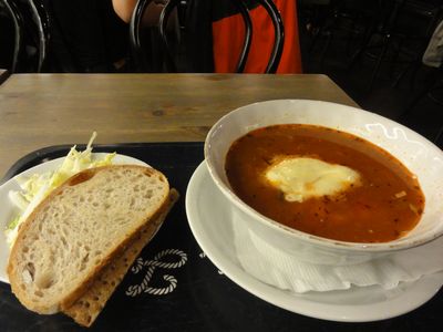 評判のフィッシュスープを食べました。魚やエビが入っている他、スープの真ん中にサワークリームが入っています。パンとサラダが取り放題なのもうれしいです。スープは、レジの前の鍋に入っているのを店員さんがお皿に入れてくれるので、待ち時間がなくすぐに食べられます。