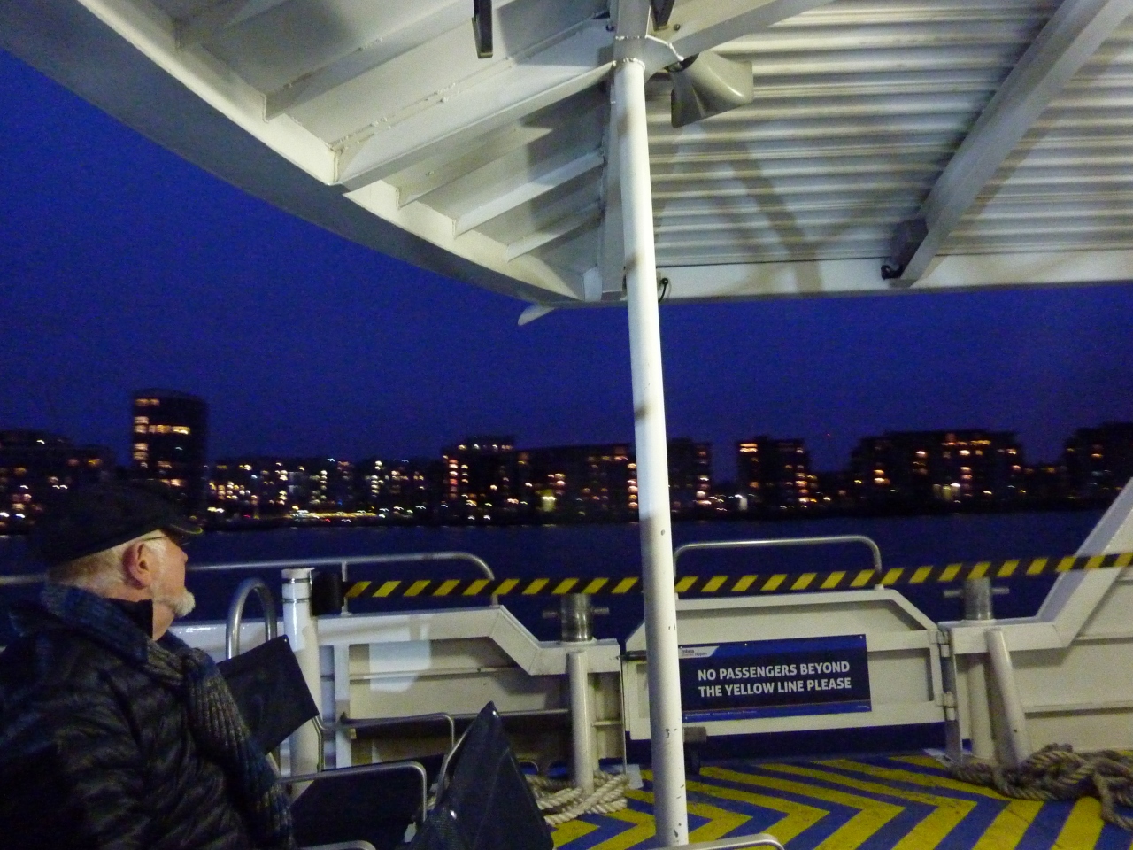 細長い船で桟橋を離れると一気に加速し、良く揺れます。暗くなっていたので船尾のデッキで景色を見ていました。ここからなら後ろ向きですが、遮るものなく景色が楽しめます。