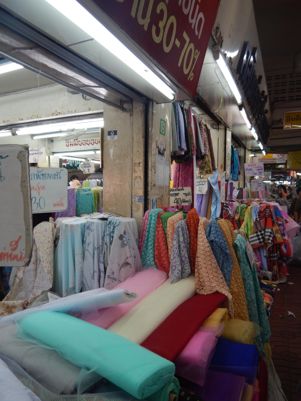 トンラムヤイ市場と道路を隔ててワーロット市場がある。ガイドブックには1階は食品を扱う未店が多いと書いてあったが、あまりなく、布を売っている店が多かった。東南アジアのこういった店では、布を売るだけではなく、仕立てまで行っているのでオーダーメードの服が簡単にできる。