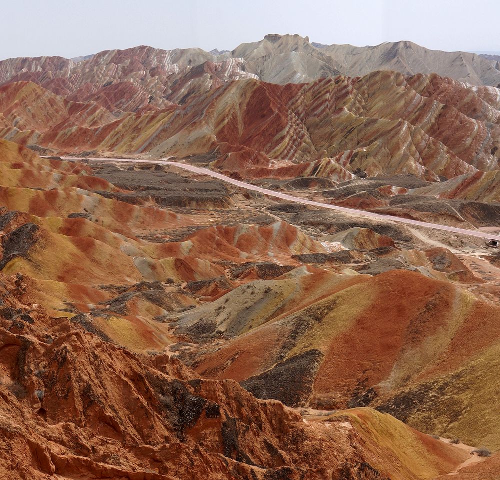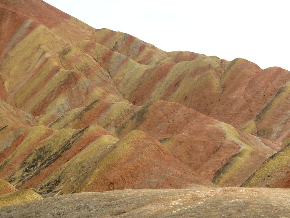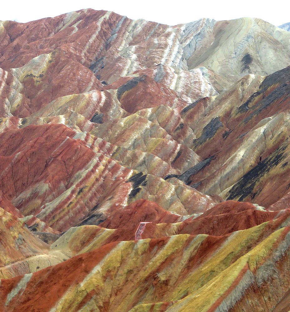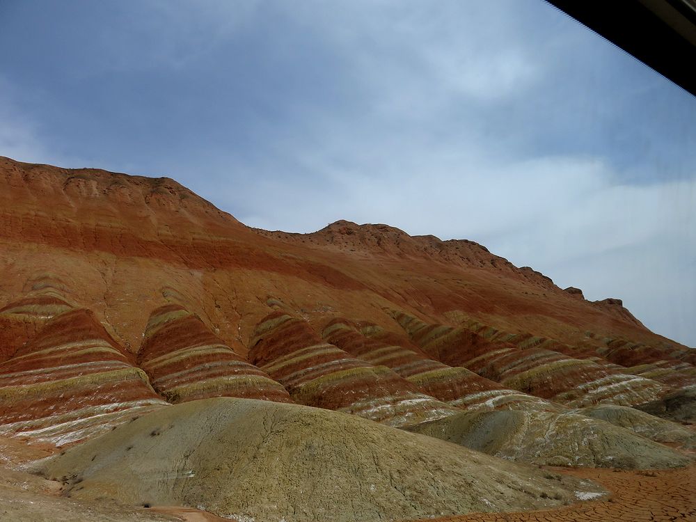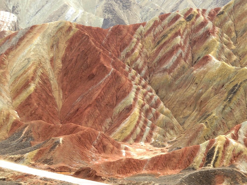 張液の町から粛南行きの公共バスで行くつもりでいたが、水溝丹霞にも同日に行きたかったので、ホテルでタクシーをチャーターし、一日で2カ所をまわってもらうことにした。最初に行ったのが水溝丹霞だった。中国のモニュメントバレーと言われているところで、まだ有名でないせいか観光客もまばらで穴場だった。ラクダや蛇、亀や人など様々な形をした石柱が点在し、遠くにはキレン山脈も見え、なかなかの絶景だった。1時間余りで水溝丹霞を見て周った後、七彩丹霞まで行き、西口から入園(他に東口と北口がある)。入園料は一人21元。ばかに安かったので(氷溝丹霞は一人40元だった)、高齢者割引があったのかもしれない。園内には、1号視景台から5号視景台まで4つの展望台があり(園内の案内図では3号がなくなっていた)、我々は西口から入ったので、1号、5号、4号、2号の順番で回ることに。視景台に上がるたびに、毎回階段を登らなければならなかった。一番奥の4号視景台からの眺めは圧巻。はるばる来た甲斐があったと思った。最後の2号は、バスを降りただけで、展望台には登らず、結局2時間あまりで園内を回り終えた。全部の展望台に登りながら回るには、3時間は必要だろう。ここは晴れた日の朝と夕方がいいと言われているが、我々が訪れた昼時でも、十分七彩丹霞の魅力は満喫できたと思う。昼時の方が、太陽が高く、影ができないので、かえって写真撮影には好都合かも知れない。なお、園内には食べ物や飲み物を売っているところも、休憩所のようなところも全くないので、特に暑いときには、飲み物や日よけの準備をして入園することが必要だろう(トイレは数カ所あった)。