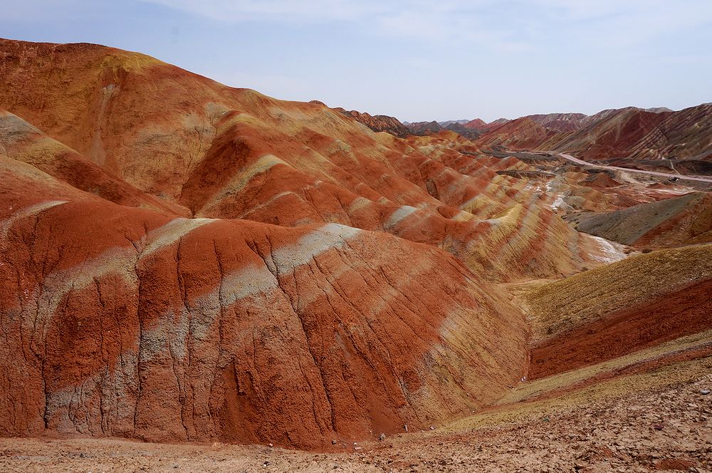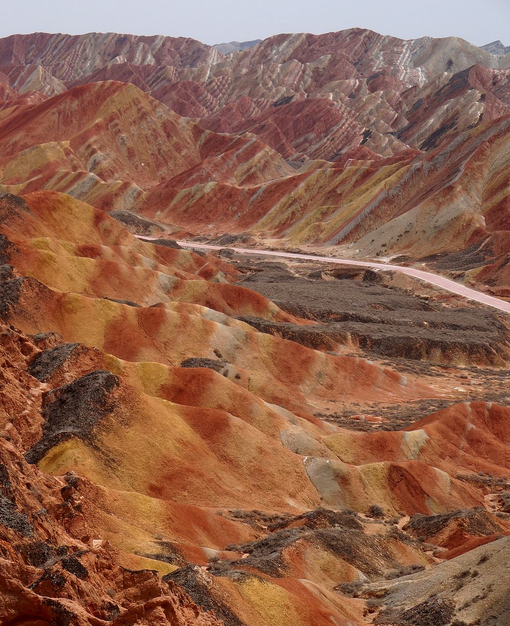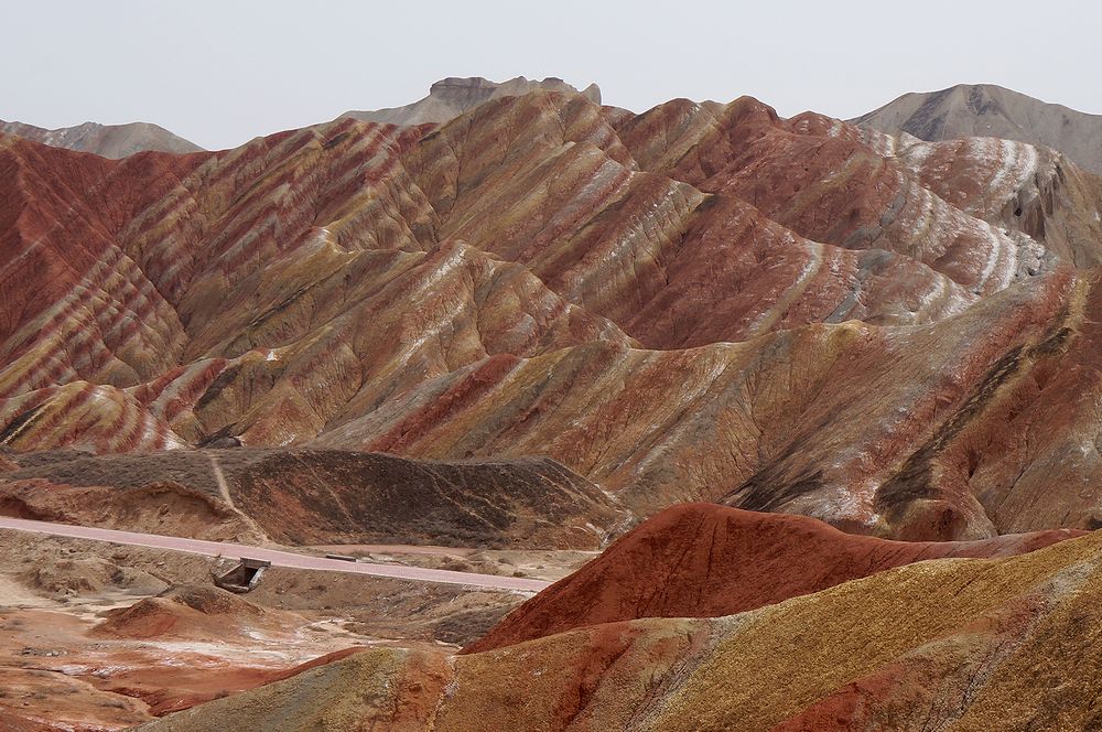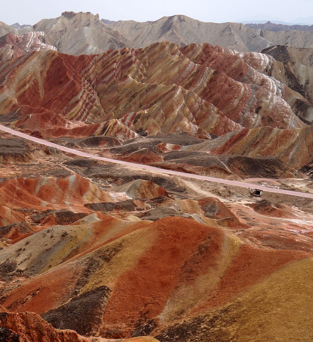 張液の町から粛南行きの公共バスで行くつもりでいたが、水溝丹霞にも同日に行きたかったので、ホテルでタクシーをチャーターし、一日で2カ所をまわってもらうことにした。最初に行ったのが水溝丹霞だった。中国のモニュメントバレーと言われているところで、まだ有名でないせいか観光客もまばらで穴場だった。ラクダや蛇、亀や人など様々な形をした石柱が点在し、遠くにはキレン山脈も見え、なかなかの絶景だった。1時間余りで水溝丹霞を見て周った後、七彩丹霞まで行き、西口から入園(他に東口と北口がある)。入園料は一人21元。ばかに安かったので(氷溝丹霞は一人40元だった)、高齢者割引があったのかもしれない。園内には、1号視景台から5号視景台まで4つの展望台があり(園内の案内図では3号がなくなっていた)、我々は西口から入ったので、1号、5号、4号、2号の順番で回ることに。視景台に上がるたびに、毎回階段を登らなければならなかった。一番奥の4号視景台からの眺めは圧巻。はるばる来た甲斐があったと思った。最後の2号は、バスを降りただけで、展望台には登らず、結局2時間あまりで園内を回り終えた。全部の展望台に登りながら回るには、3時間は必要だろう。ここは晴れた日の朝と夕方がいいと言われているが、我々が訪れた昼時でも、十分七彩丹霞の魅力は満喫できたと思う。昼時の方が、太陽が高く、影ができないので、かえって写真撮影には好都合かも知れない。なお、園内には食べ物や飲み物を売っているところも、休憩所のようなところも全くないので、特に暑いときには、飲み物や日よけの準備をして入園することが必要だろう(トイレは数カ所あった)。