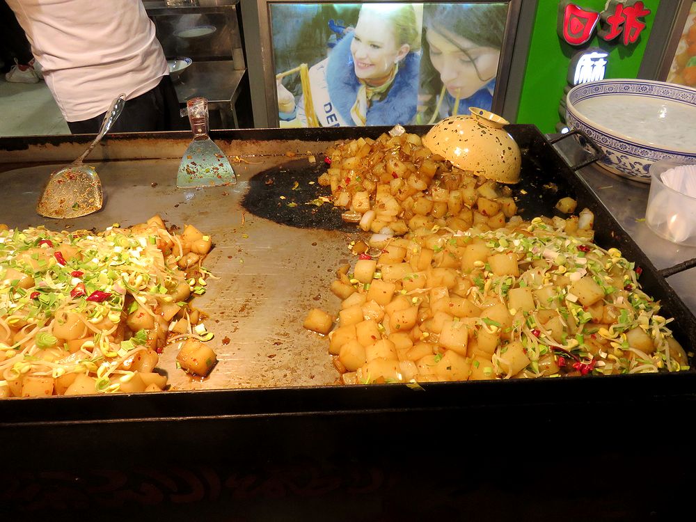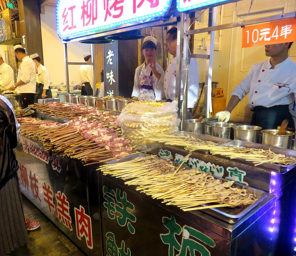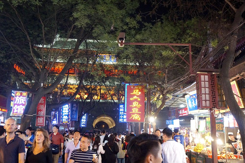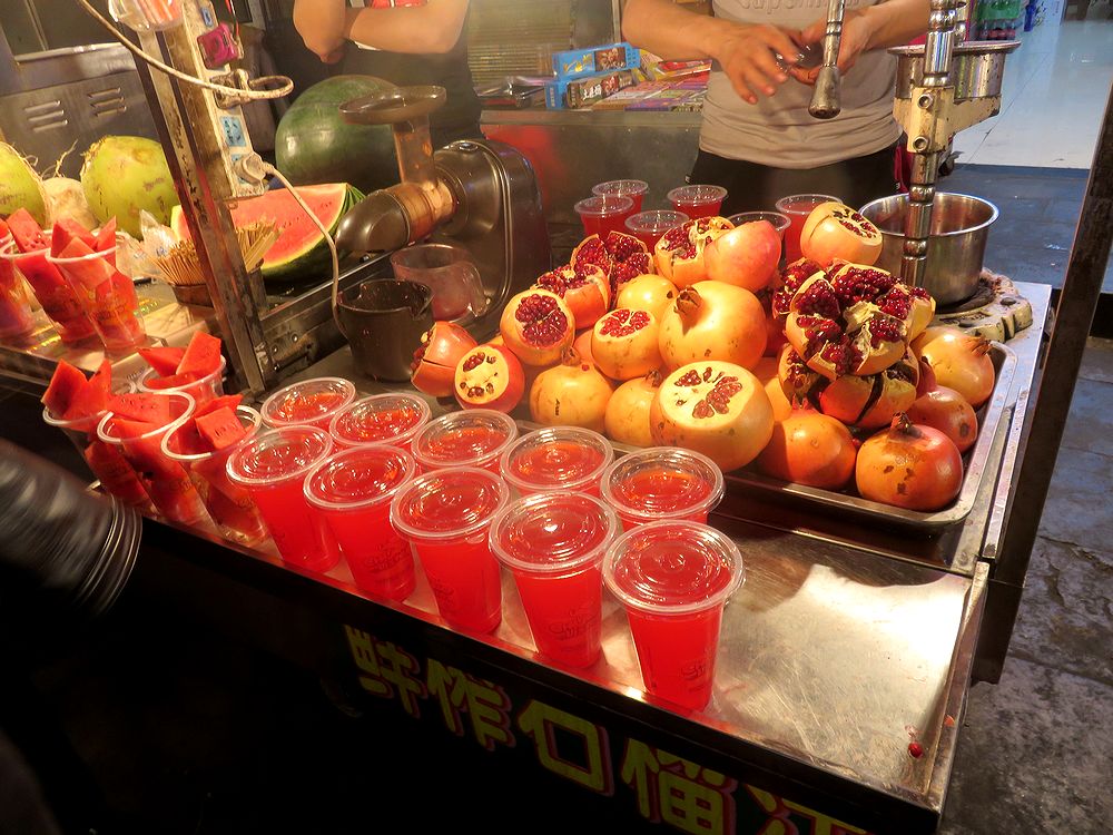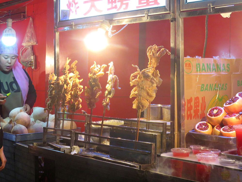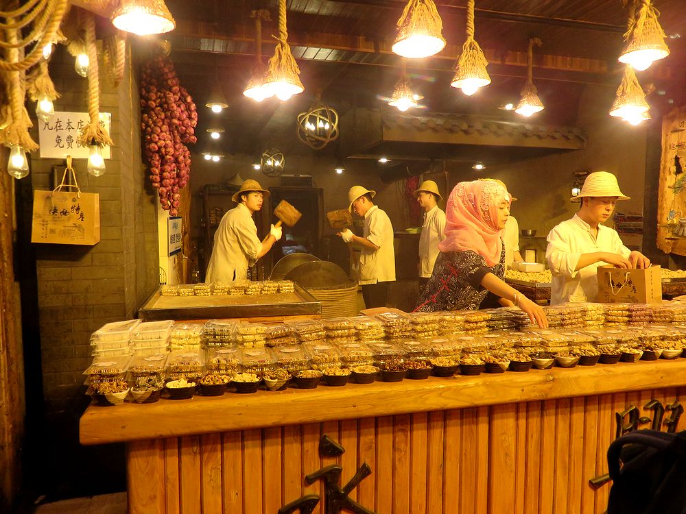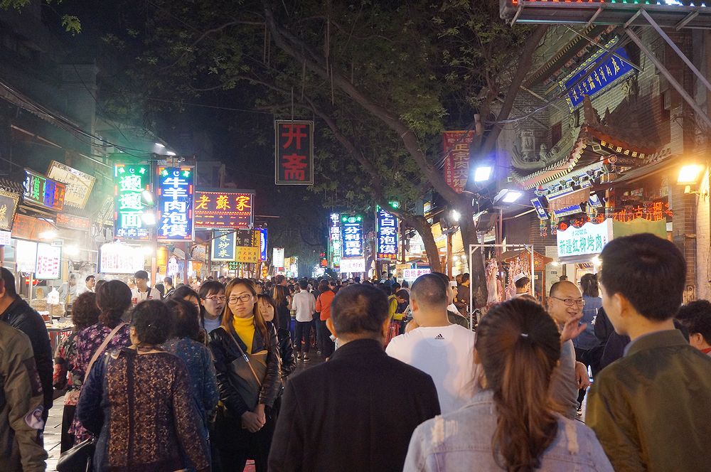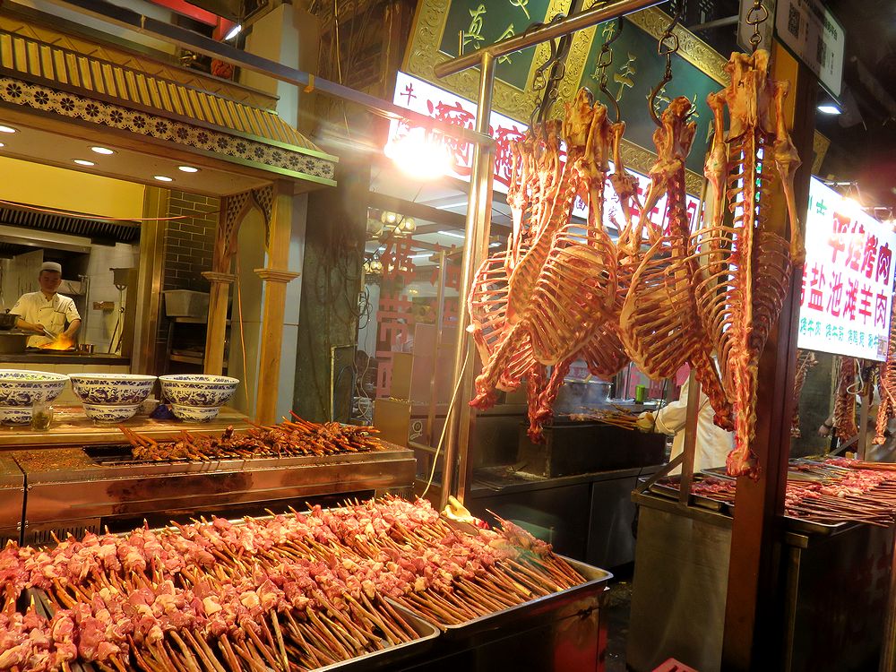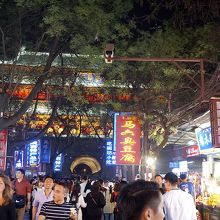 西安駅近くのホテルの最寄りの地下鉄五路口駅から一回乗換えて、15分ほどで西安中心部の鐘楼駅に着き、鐘楼、鼓楼のすばらしいライトアップを見学したときに、回民街に出会いました。街は両側が回族のお店が立ち並び、まるで正月前のアメ横状態ですごい人波でした。店の外では珍しい食べ物が売られていました。串焼きの店や色鮮やかなザクロのジュース、さらに冷麺のようなものや、クルミなどの他にサソリのから揚げなども売られていました。一番行列を作っていたのが、鳥のもも肉を炭火で焼いたものでした。おいしそうだったけど、旅の最後にお腹をこわしたくないので、無難な冷麺とコンニャクイモの辛いいためものを店内で食べました。ライトアップ見学のついでに立ち寄ることをお勧めします。夜は混みますが、セキュリティチェックが厳しく、安価で渋滞もない地下鉄でのアクセスが便利です。