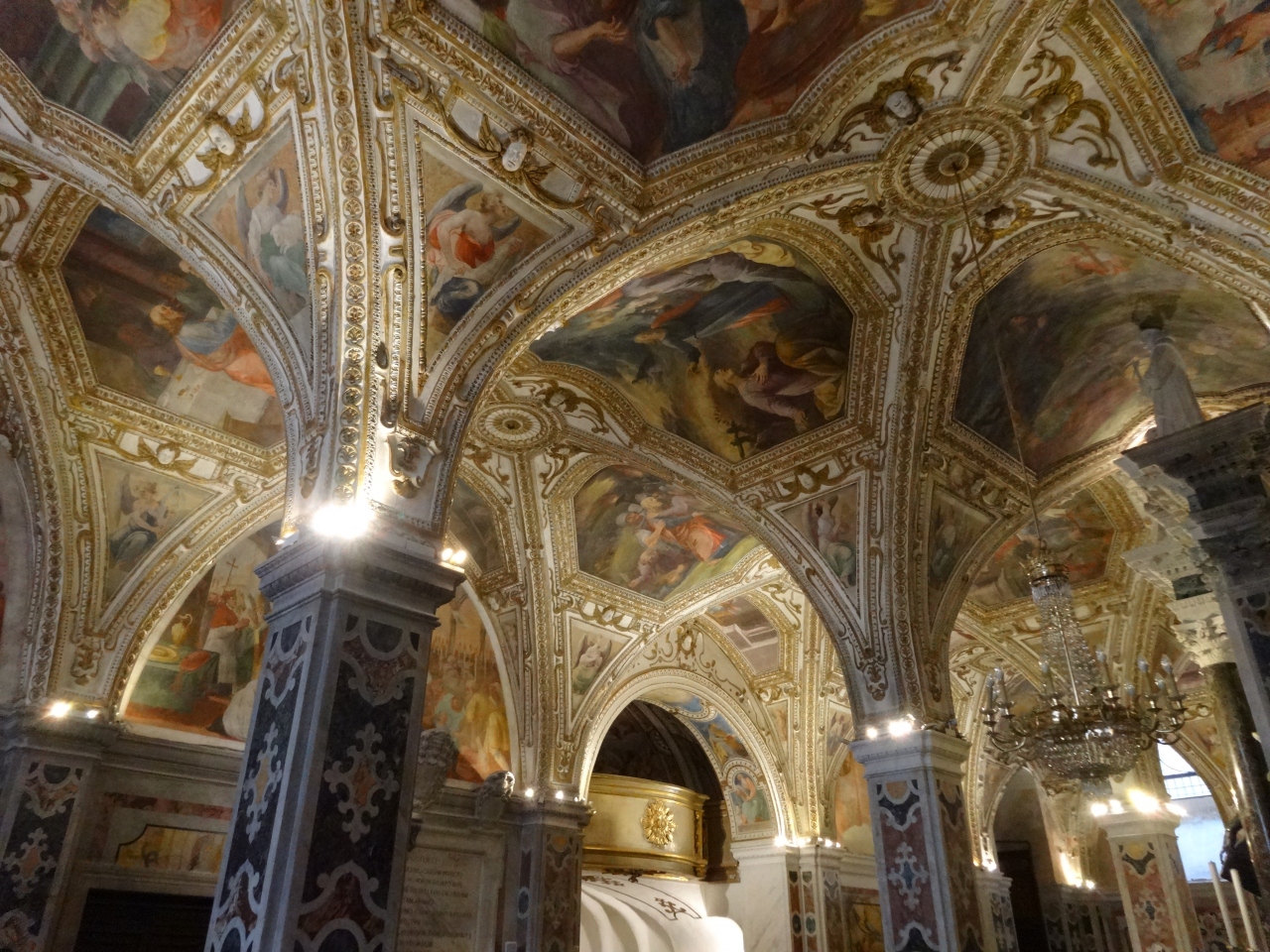 地下にあるクリプタが壁から天井まで大理石と金色の装飾で覆われており、本当に素晴らしくて、ドゥオモの見学の中で一番時間がかかりました。中央には聖アンドレアの威厳のある巨大な彫刻が設置されています。聖アンドレアの頭骨が保管されているとのことでしたが、さすがに実物は見られませんでした。