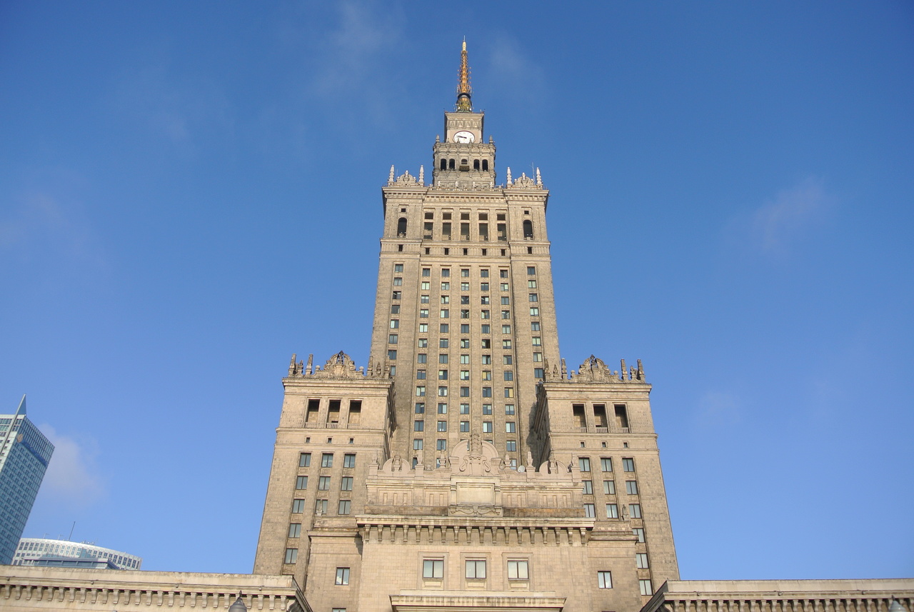 想像以上に圧倒的な存在感です。立派な建物ですが、逆に素朴なイメージのポーランドにはそぐわない感じでした。夜のライトアップも緑や青や紫など毒々しい色合いで不気味でした。ワルシャワのどこからでも見えるランドマークのようになっています。内部には企業オフィス、郵便局、映画館、コンサートホール、博物館、図書館、劇場などがあります。展望台からはワルシャワの街が一望でき、パノラマスポットとなっています。