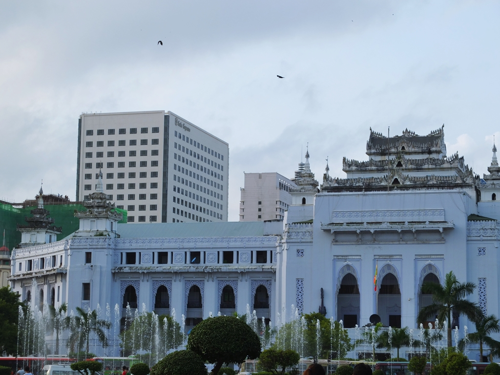 マハ・バンドゥーラ公園に面した大きくて立派な建物。こちらも英国領時代に建てられたもので、噴水の向こうにそびえる姿にはまるで宮殿のような威厳を感じました。涼しげなペールブルーがかった色は、2012年に塗り直されたものだそう。