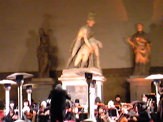 その一角にいくつもの彫刻が並ぶランツィのロッジアがあります。そこがカウントダウンの舞台。。。なんとオーケストラの生演奏です。