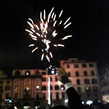 ヴェッキオ宮の塔の時計が12時を指す。ステージではクラシック音楽の演奏が続く中イタリア人たちがみんな一斉に大声でカウントダウン!歓声が上がり、抱き合ってキスするイタリア人たち!みんな大騒ぎ~!激しい爆竹の音!白煙筒の煙!過激~!!そして新年を祝う花火~!!歴史ある建物をバックにあがる花火はそれはそれは素敵でした~!