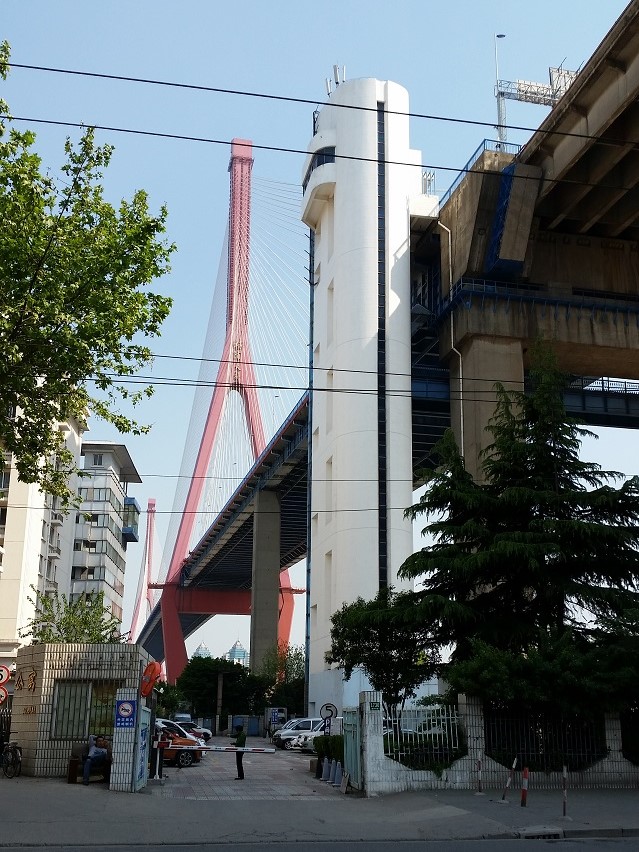 魯迅公園(正確には隣接する龍之夢ショッピングセンター)と浦東空港を結ぶリムジンバス「機場4号線」も通る、黄浦江に架かる巨大な橋です。アプローチの部分も含めた全長8534メートル、主橋部長さ1178メートル、主塔高さ208メートル、水面からの高さ48メートルという巨大な橋で、復興島に行った際に地上から見上げるために訪れました。予想通り圧巻ですね。ただ、黄浦河に面した場所は工場や発電所などの敷地になっているので、なかなか良いアングルで写真に残すことが出来ませんでした。河を渡る船に乗って写すのが良いかもしれません。