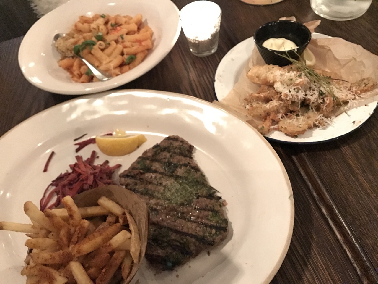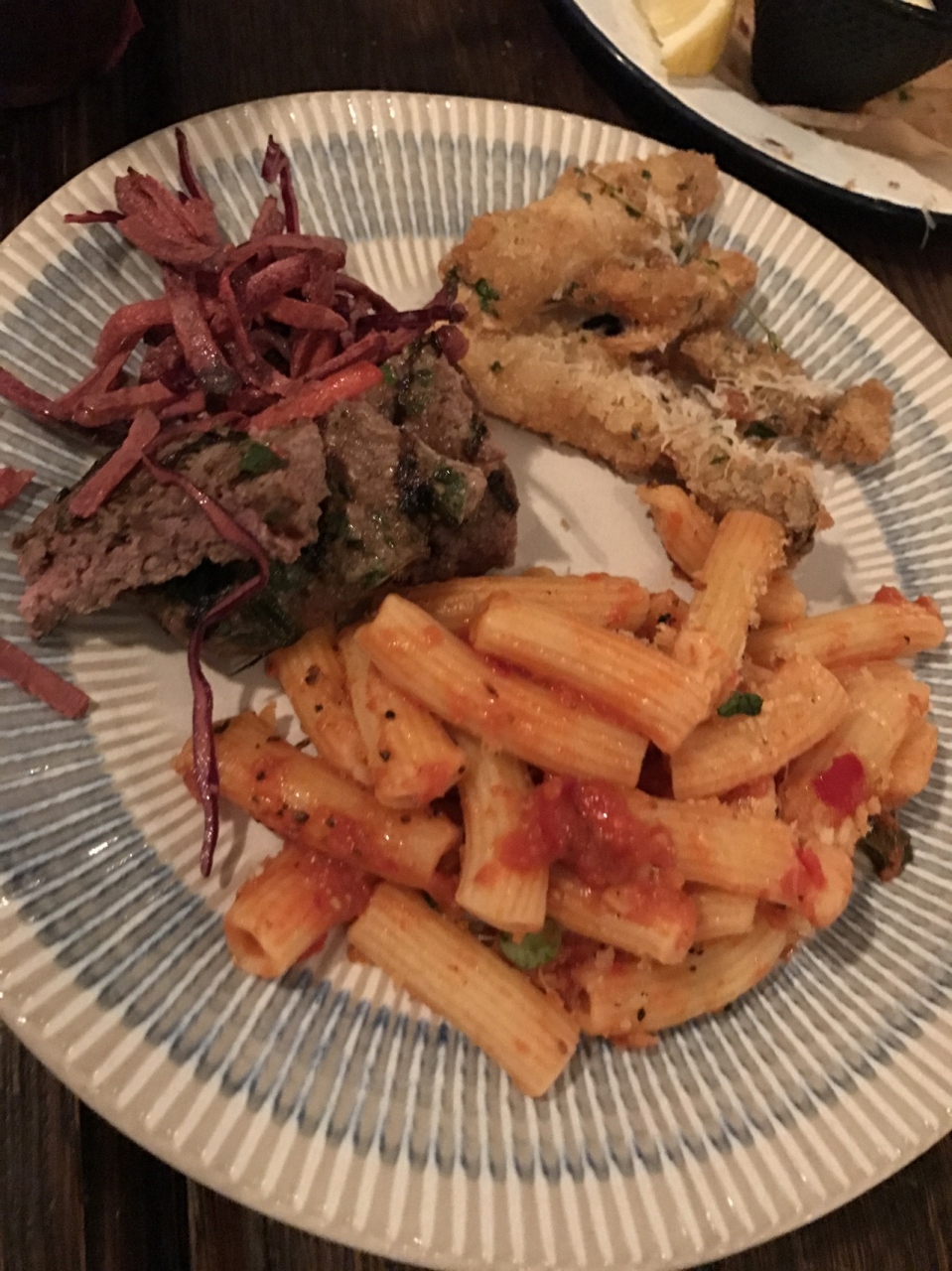 パスタはアラビアータを頼んだので、スパイシーなのは分かっていましたが、味はかなり辛かったです。肉料理は絶品でした!
