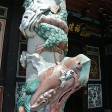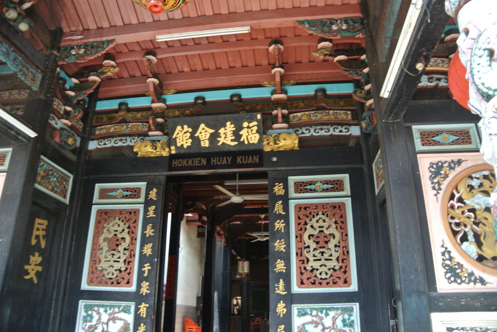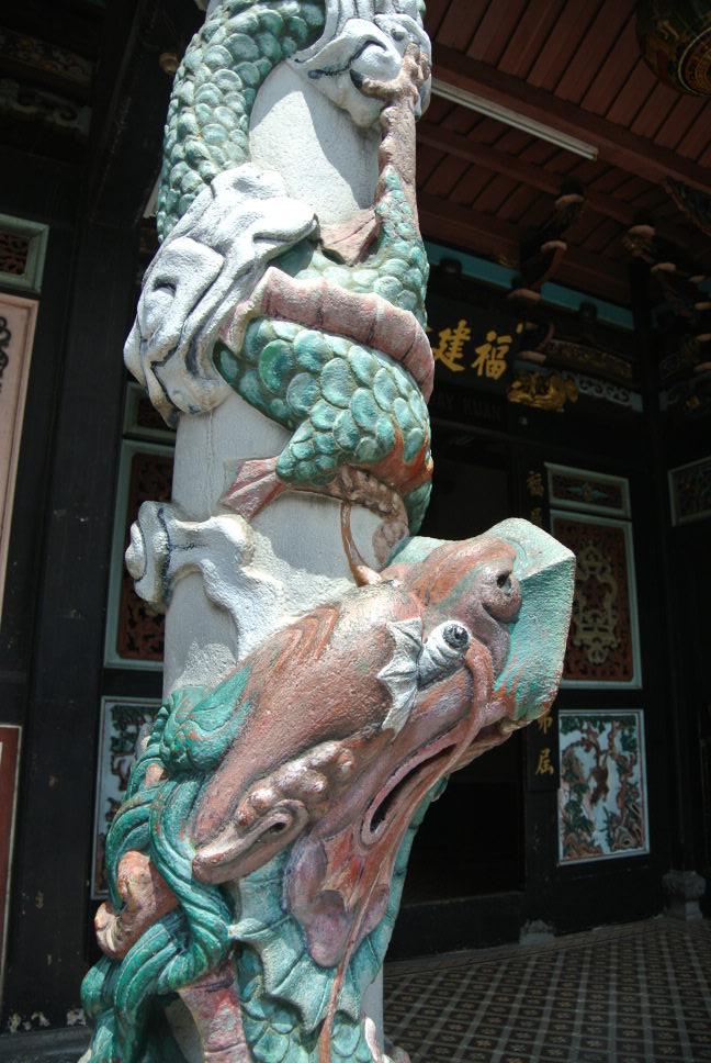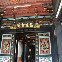 見た目は中華系の寺院のような賑々しい感じでしたが、門の上に「福建会館」という額が掲げられているので、すぐわかります。門は開いていましたが、ひとけはありませんでした。柱にも龍などの彫刻があって、とても目立つ門構えの建物でした。