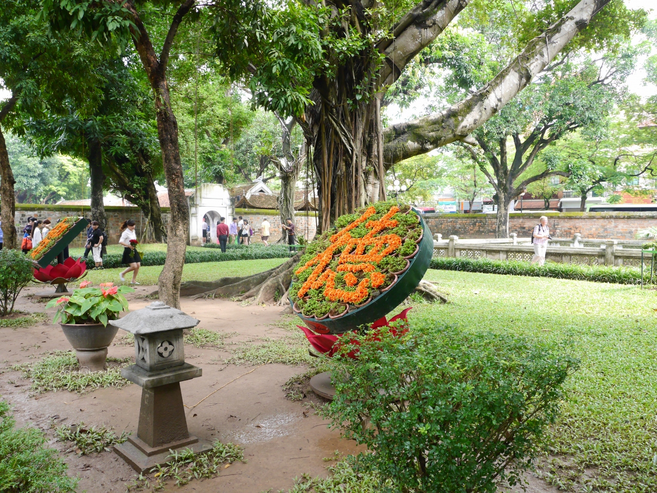 門を潜り、中庭を歩き、もう一度門を潜ってやっと境内、本堂が見えてきます。かなり奥行があり、池などもあって人混みに紛れて歩くのは大変でした。境内に亀が置かれ、その上に歴代の試験合格者名が刻まれた碑があったり、中庭には花で徳、義、等の花文字が飾られていました。