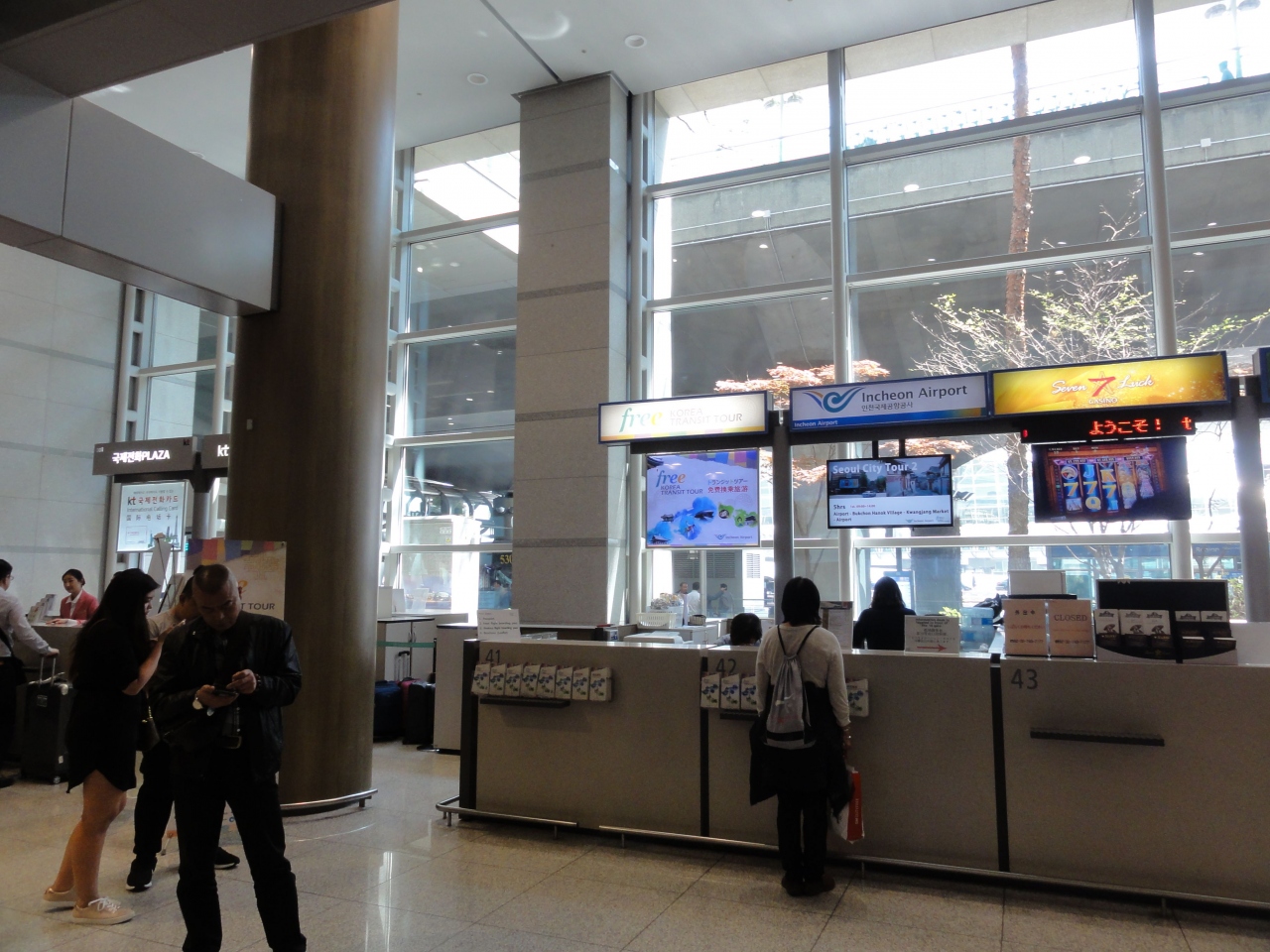 入国審査・税関をすぎ、8番ゲートの近くのトランジットツアーのカウンターでチェックイン、ツアー参加のバッチを受け取り、13時発ソウルシティツアー4に、出発。事前にトイレに行っておいた方が良いです。