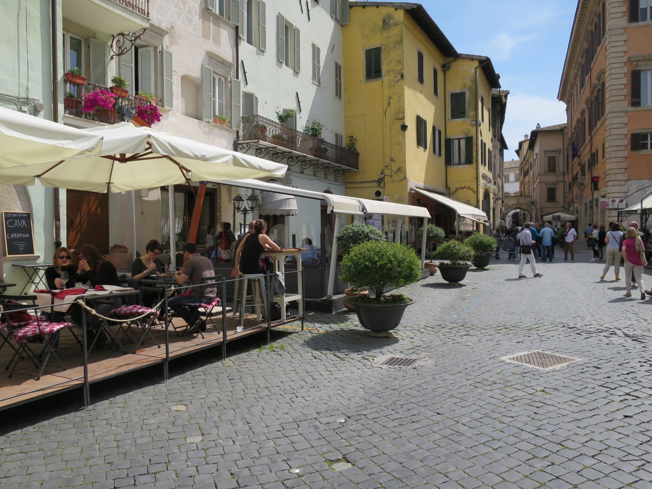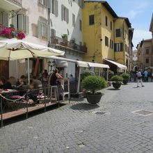スポレート旧市街中心部にある広場がメルカート広場です。名前の通り、いろんなお店があり、レストランもあるのでにぎわっています。丁度午後3時頃に通りかかったので、お茶をする人なども多かったです。疲れていたので自分もジェラート屋で休憩しました。