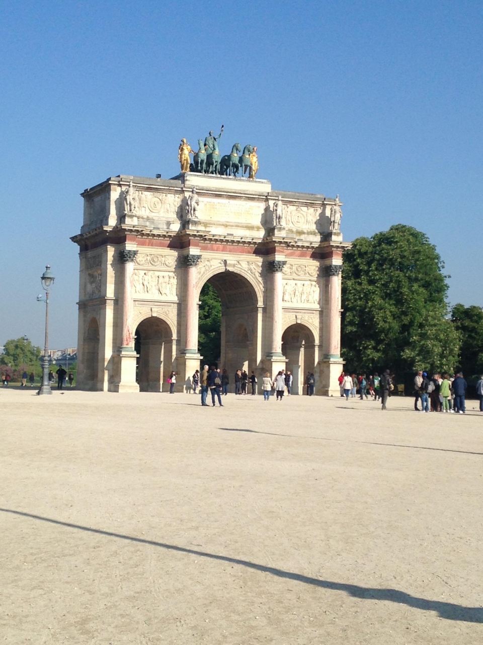 カルーゼル橋を渡りまっすぐ進むと右手にルーブル美術館のガラスのピラミッド左にカルーゼル凱旋門がありました。凱旋門の上には像がたっている。パリの凱旋門よりはだいぶ小さいが見ごたえあります。この凱旋門をぬけるとチュイルリー公園にぬけます。