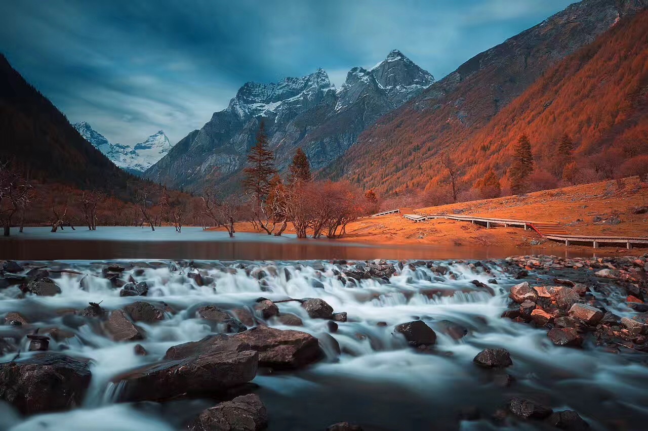 画我会と一緒に丹巴と四姑娘山に行ってきました、天気に恵まれて青空、雪山と雲3点も揃って、最高でした。双橋溝は一番好きなところで、写真をいっぱい撮りました、紅葉の時期が一番綺麗でしょうね、秋必ずきます。