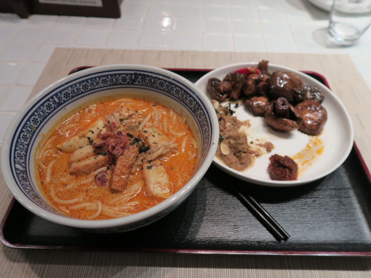 ラクサは初めてたべたが、見かけはクリーミー担々麺みたいで、スープはゴマダレを薄くしてピリ辛にした感じ。最初はなんともだったが、後半病みつきだった。