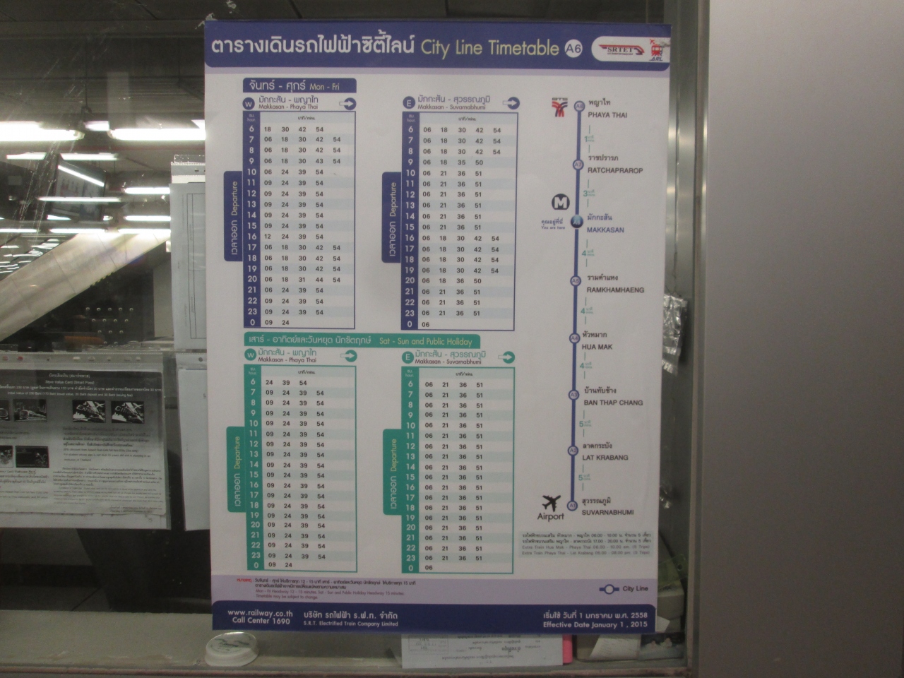 マッカサン駅でエアポートレールリンクの時刻表を見かけました。タイ語ですが、分かりやすかったです。早朝の時間帯にスワンナプーム空港を出発したり、夜遅い時間帯に空港に到着するときは利用できないことが分かりました。利便性が高いので、もう少し運行する時間帯を長くして欲しいところです。