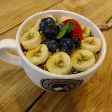 ハワイ到着日、JALアロハラウンジ後にまず、朝食かなとモアナサーフライダーからロイヤルハワイアンセンターまで歩き、2階にあるアイランドビンテージコーヒーにてアサイボールを注文した。大きなマグカップ内には、バナナ、ブルーベリー、イチゴとのかっており、酸味の効いた味のアサイであった。席が混んでいたので子連れには大変かも。