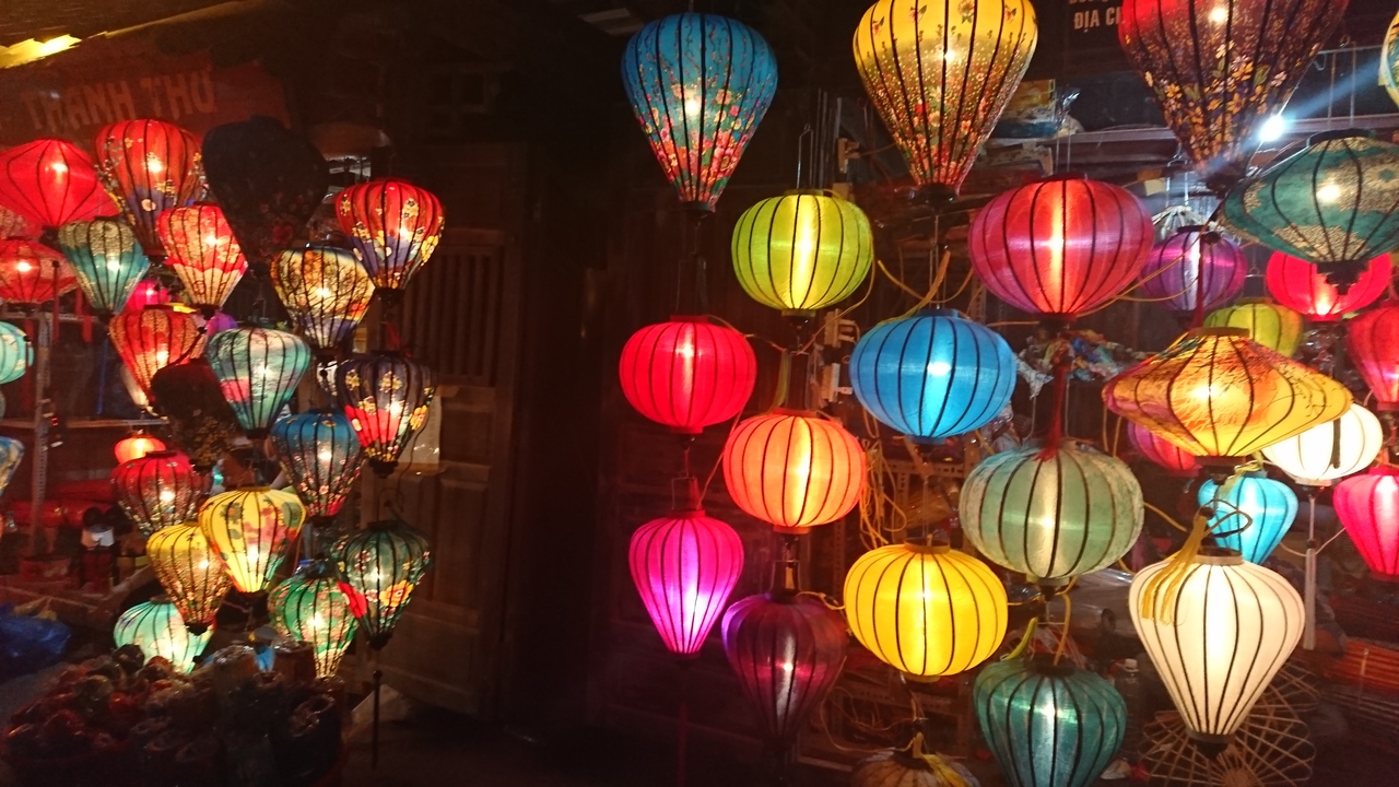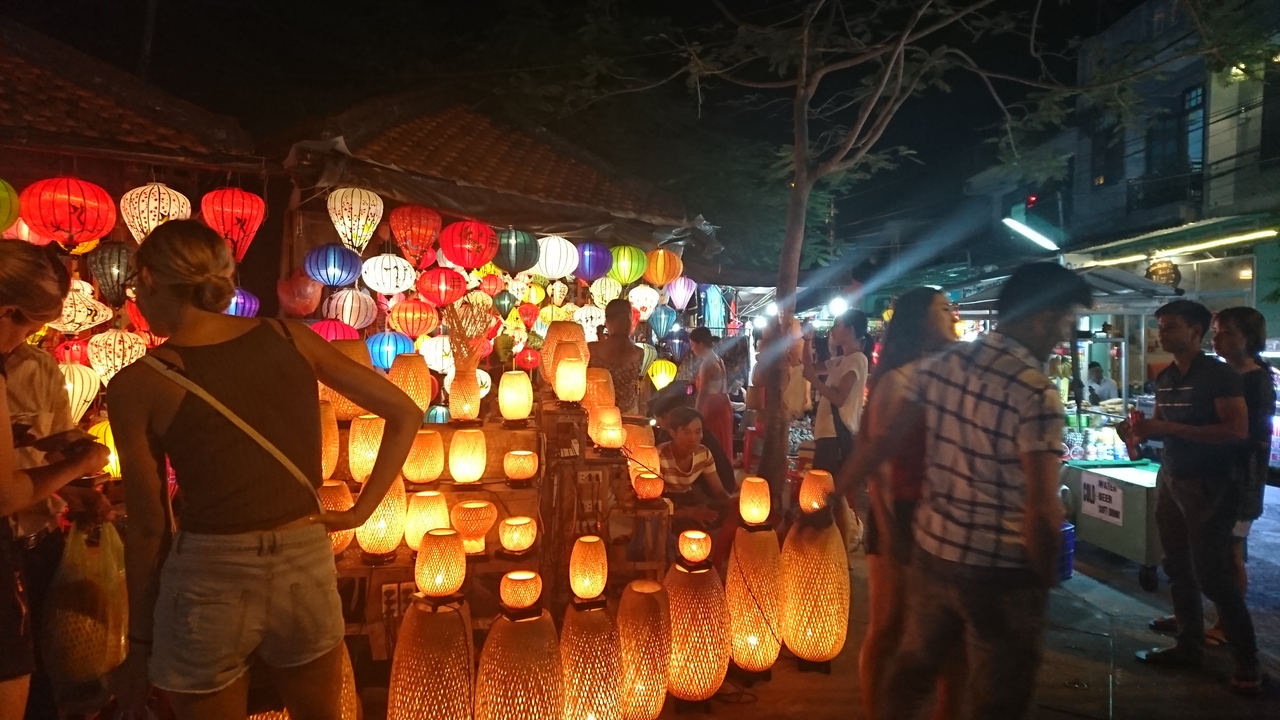 アンホイ島のグエンホア通りが夜になるとナイトマーケットになり華やかです。入り口付近のランタン屋さん色とりどりのランタンが並びとても綺麗でその先もいろいろな小物の屋台などが出ています、ランタン祭でなくても店はいっぱい出ていますし人出もいっぱいだったので、ランタン祭だと混み過ぎるのかなと思いました。