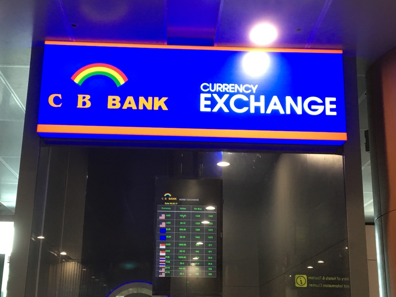 ヤンゴン空港の国際線到着口を出たところに両替所がありましたが、表示をみると、米ドルの両替では、50ドル札と100ドル札、それ以外とレートが違っていました。両替には50ドル札を用意するとお得です。作業がゆっくりで、とても時間がかかりました。