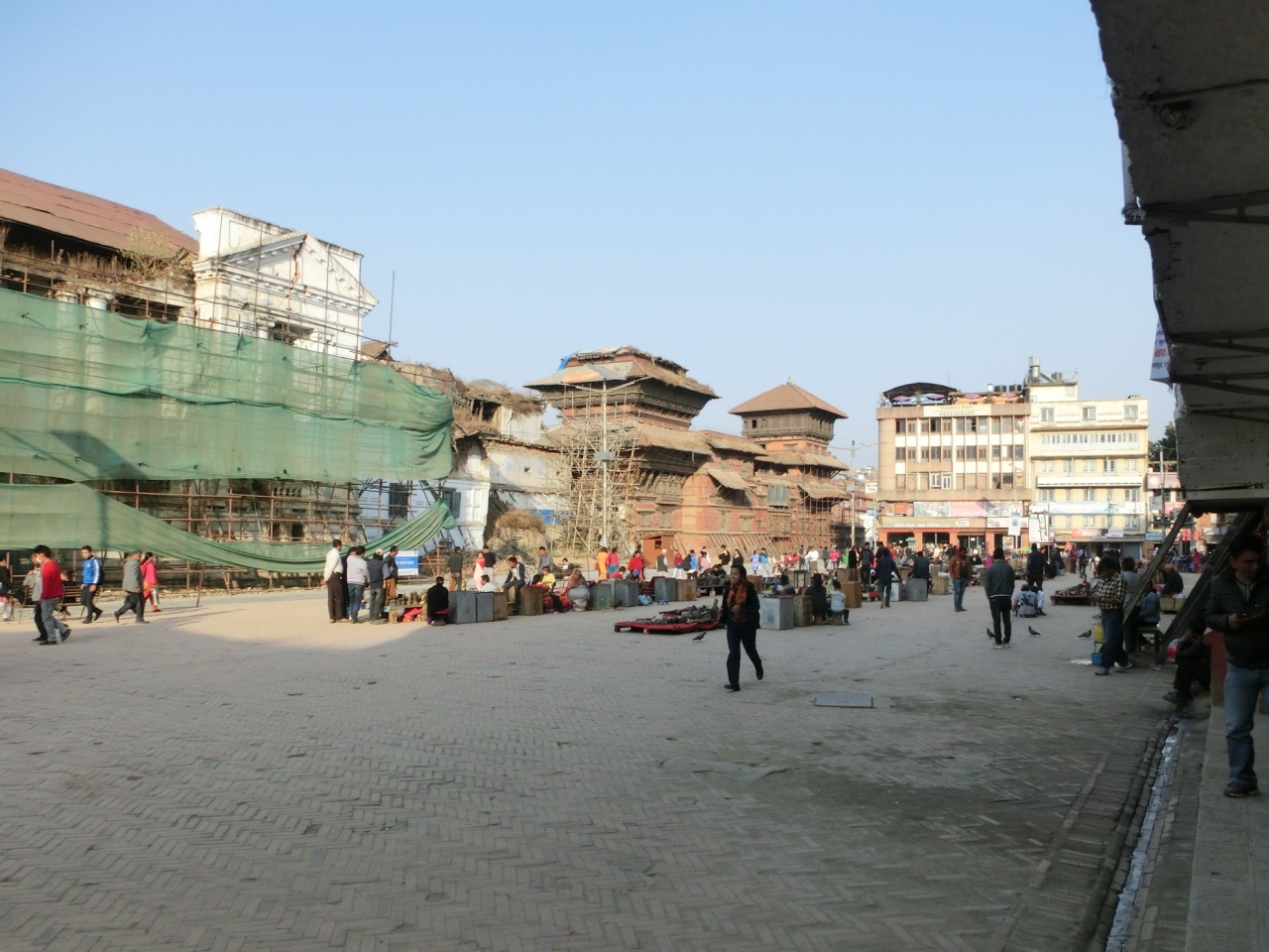 駐車場から10分程歩くとダルバール広場に着きました。ダルバールと云う名はパタンでもありますが、ネパール語で「宮廷」を意味するとのこと。ここでも地震の被害で倒壊した建物や棒で支えている建物が多く見られますが、修復も始まっていました。
