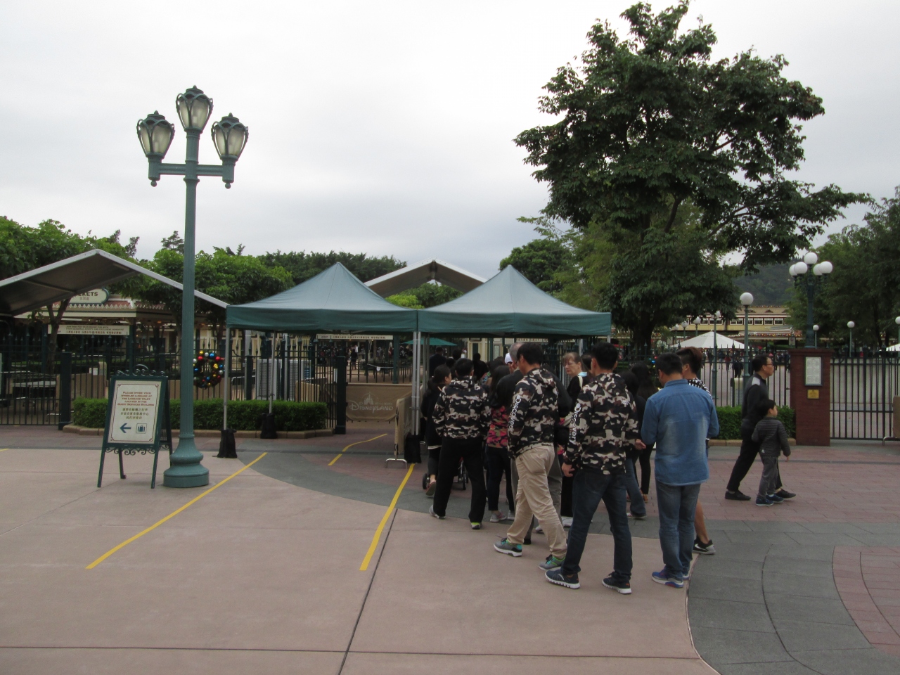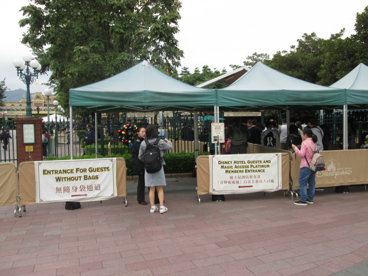 香港ディズニーランドでチケット購入後、一人ずつゲートを通過しました。各ゲートにはスタッフがいて効率良く処理していました。中国系らしくせっかちな人々がいましたが、大きな混乱はなくみなさん整列して並び入場していました。