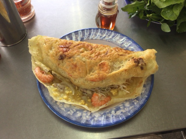 タンディン市場近くの路地角にあるバインセオのお店。有名店であるためか、午後でも満席であった。少し待ってテーブル席にすわった。建物の横のオープンエアに長いテーブルとイスが並んでいて相席になる。バインセオとコーラーを注文した。バインセオは小エビが沢山あり、もやし等々も入り旨く、ボリュームたっぷり。コーラーは氷入りのグラスに注いで飲み身体を冷やすことができた。バインセオを食べている途中、隣の地元の人に食べた方を教えてもらったり楽しい会話もできた。中心部から離れているが、レバンタム公園やタンディン市場の散策の途中にでもここで食事をするのがいいかもしれない。