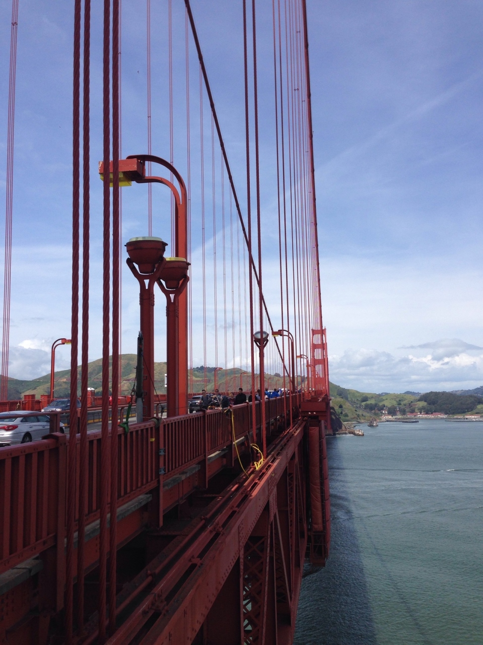 今回は徒歩で。対岸までは行かず半分の所で折り返しましたが それでも結構な距離がある本当に大きな橋です。車道側を見ると橋の上であることを忘れてしまう程向こう側が遠く、下を覗けば海面の波しぶきはおもちゃの様なサイズ。スケールの大きさにただただ感動です。